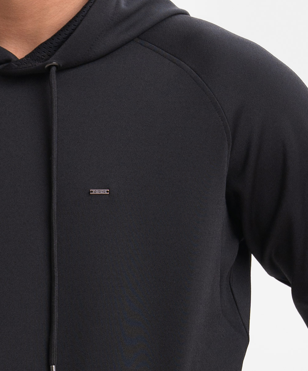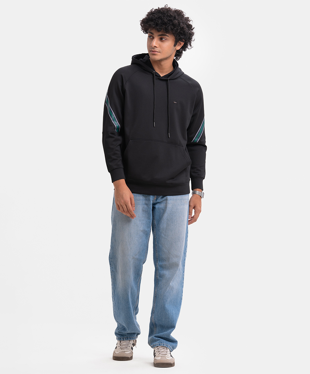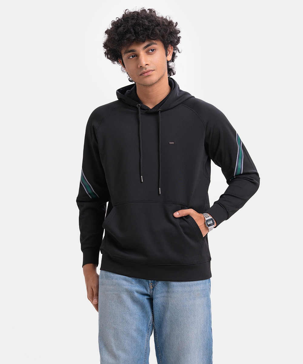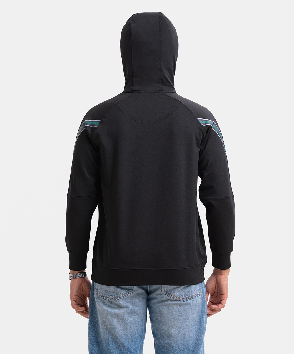 Men’s hoodie sweatshirt in interlock knit fabric. Adjustable drawstring at hood. Full-sleeved with kangaroo pockets and print.