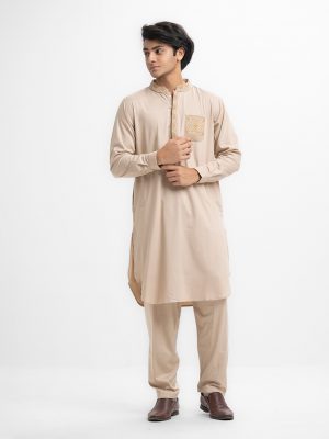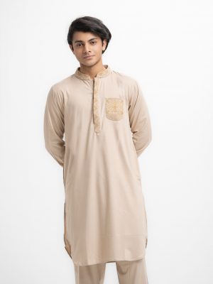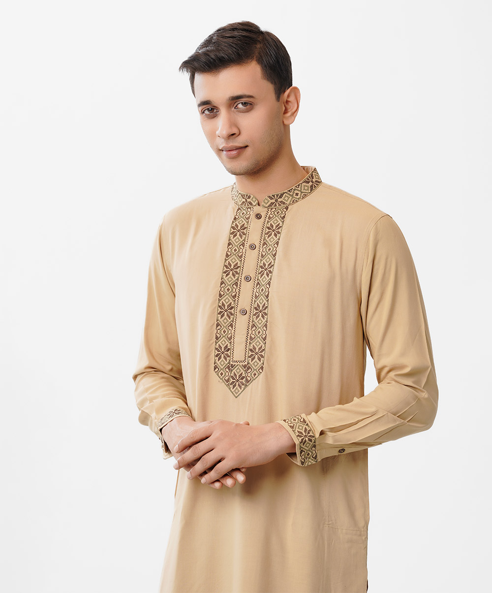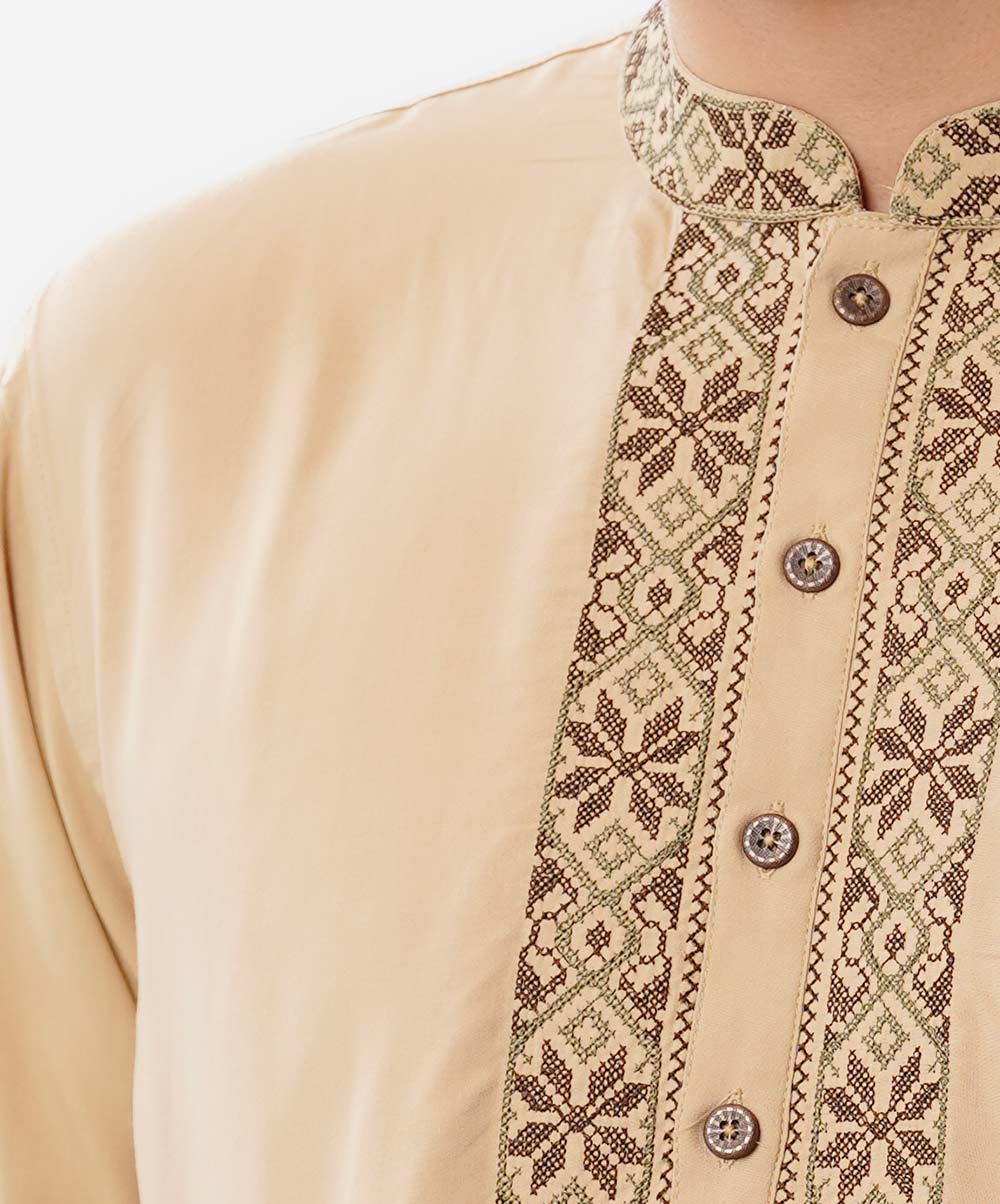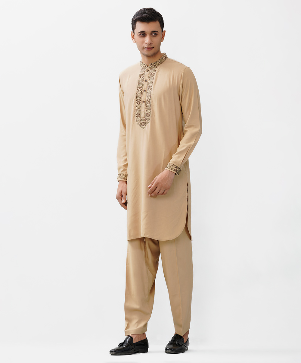 Men’s Kabli set in Viscose fabric. Embroidery on the collar, placket and sleeves. Inseam side pockets and paired with kabli pajamas.
