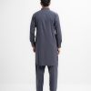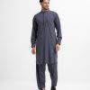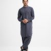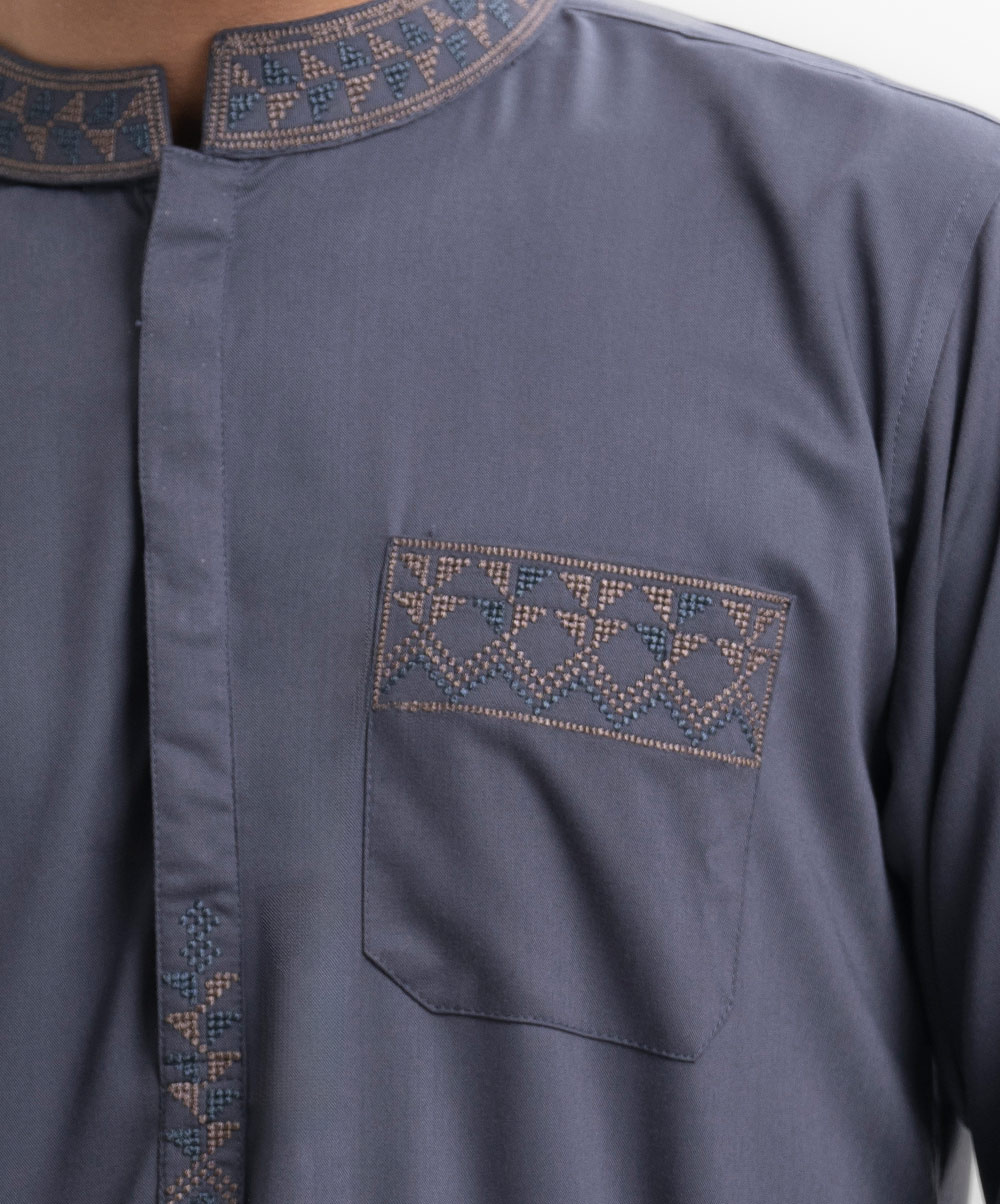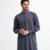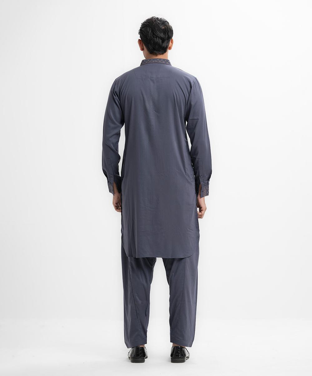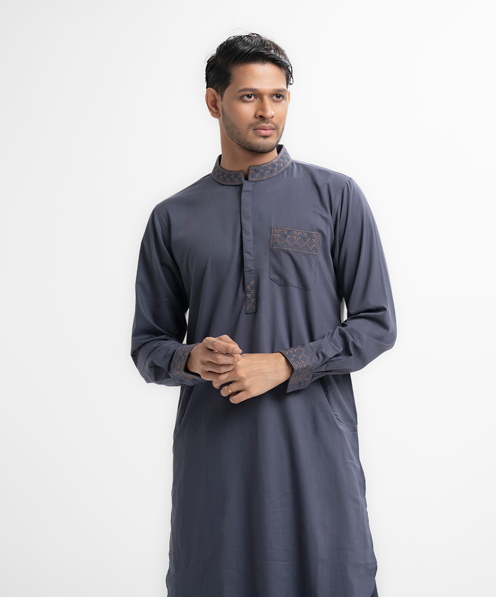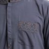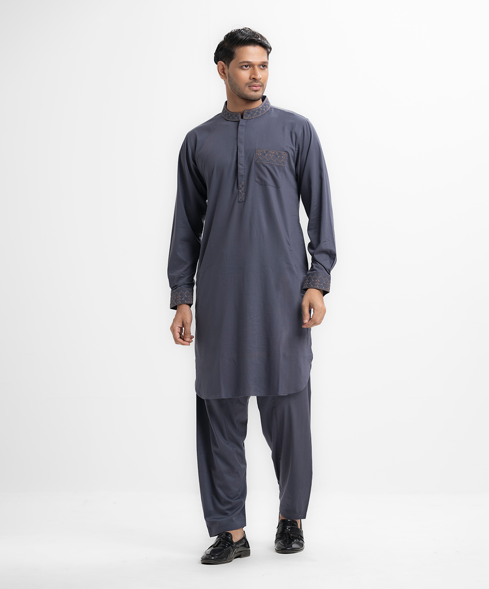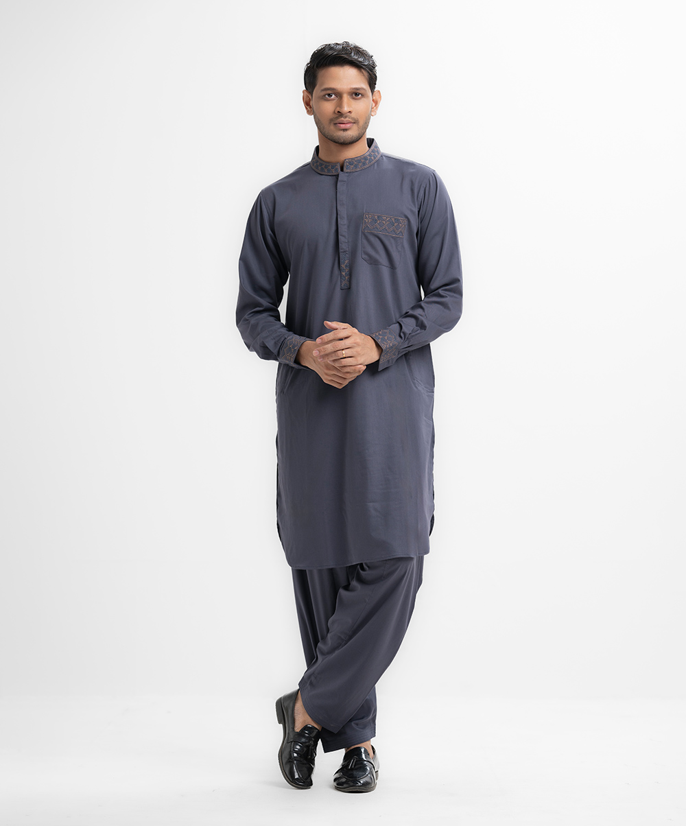 Men’s kabli set in cotton-blended fabric. Embroidery at the mandarin collar, chest pocket and sleeve cuffs of a kabli suit with a pajama set.