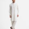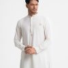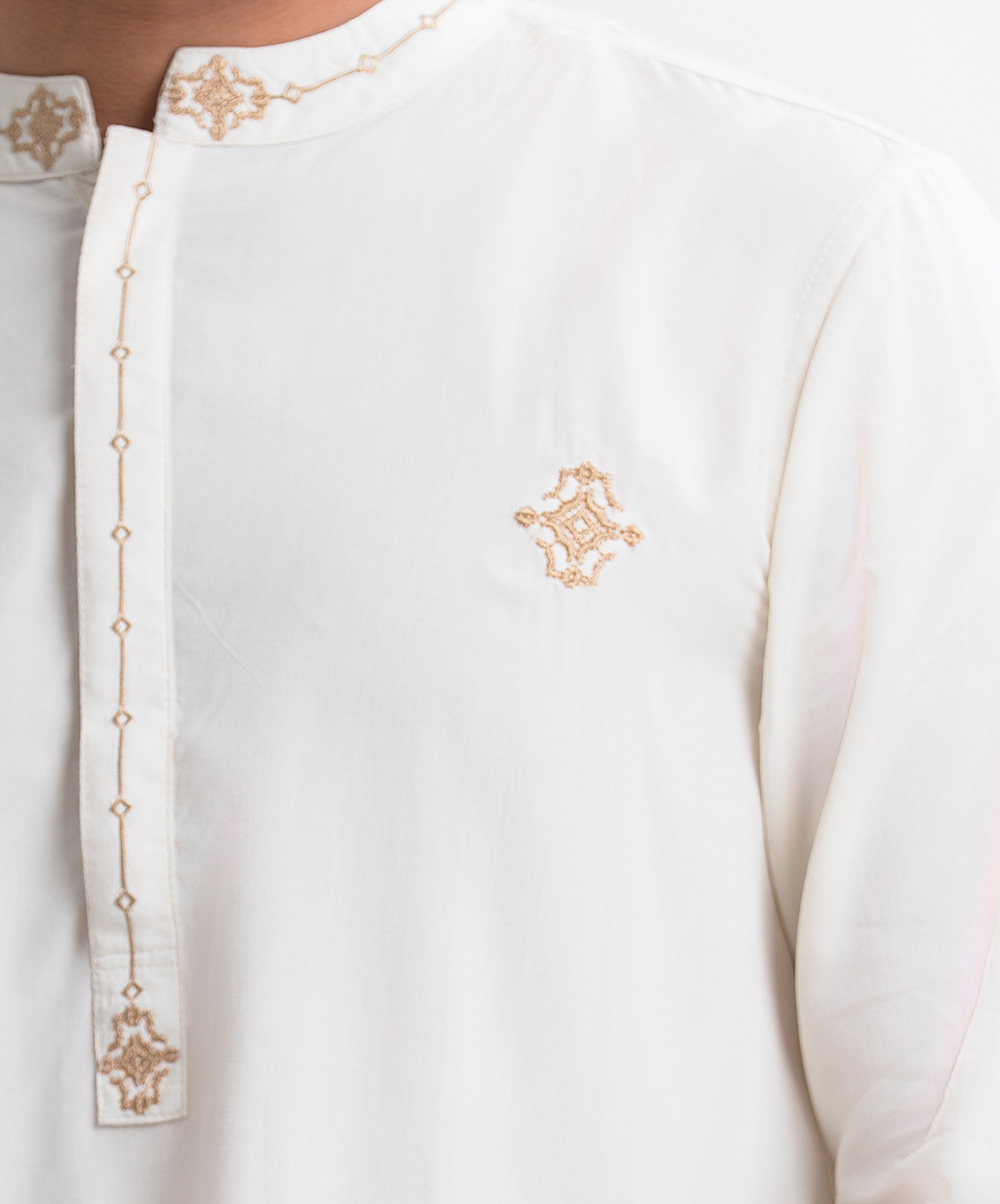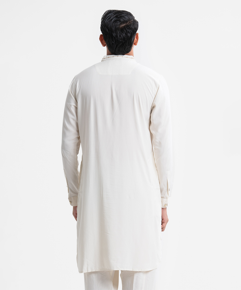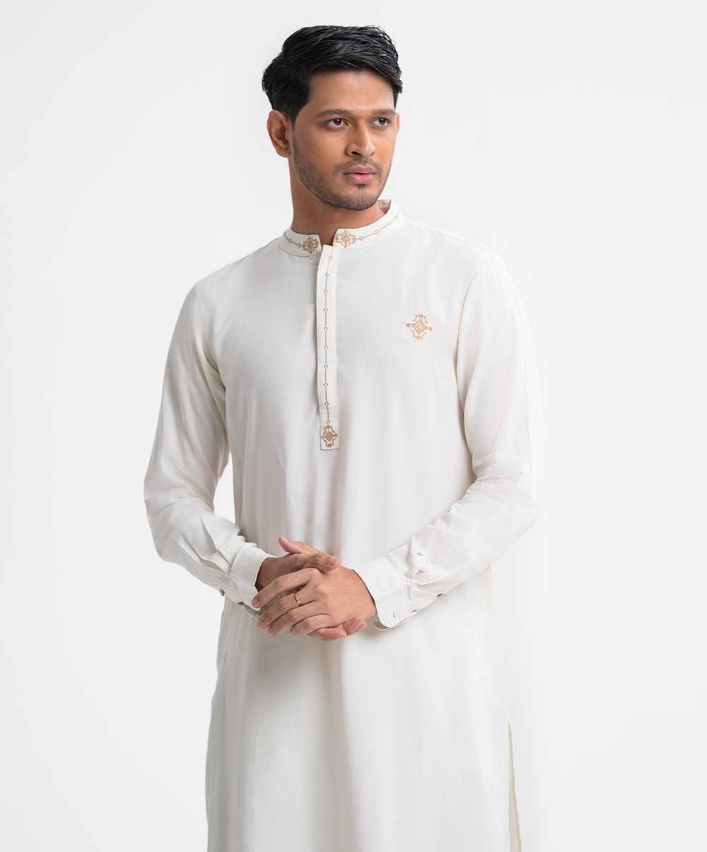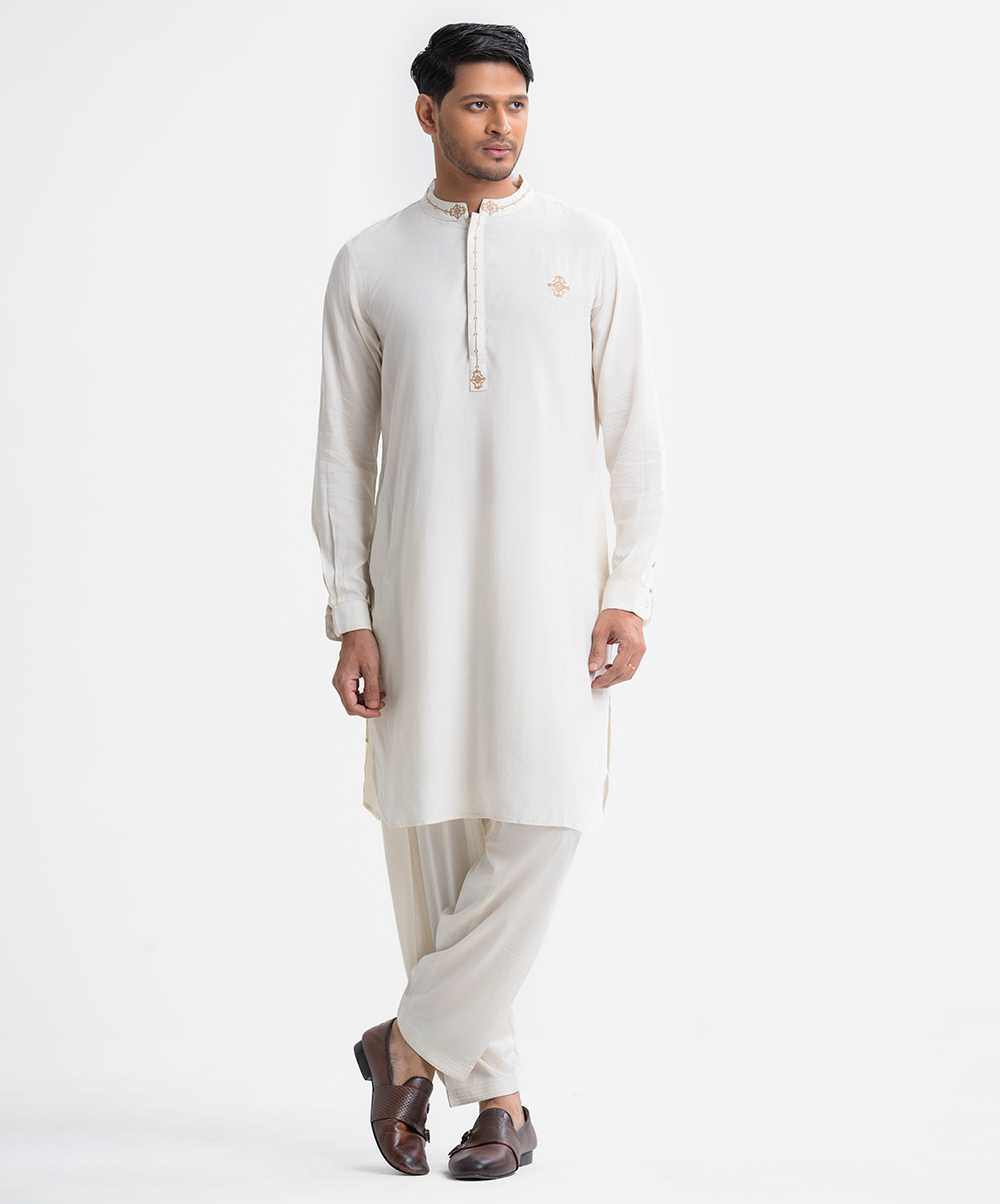 Men’s kabli Panjabi Set in viscose fabric. Mandarin collar, inseam pockets and long sleeves. Embroidery at the collar and placket. Paired with viscose pajama.