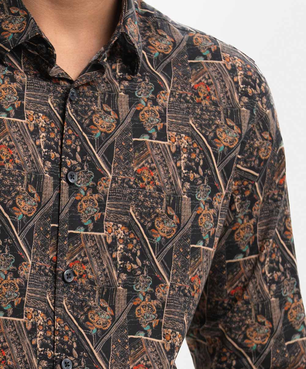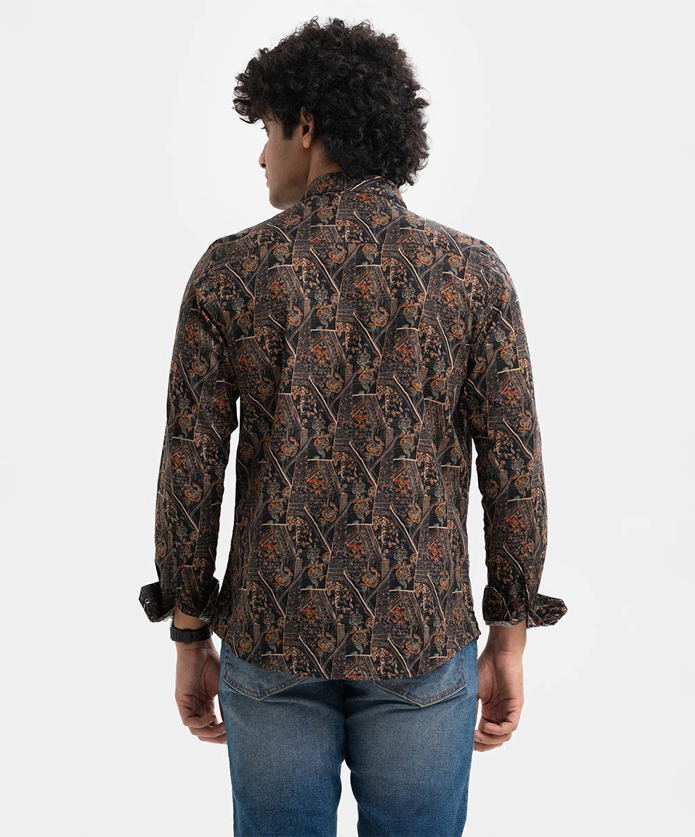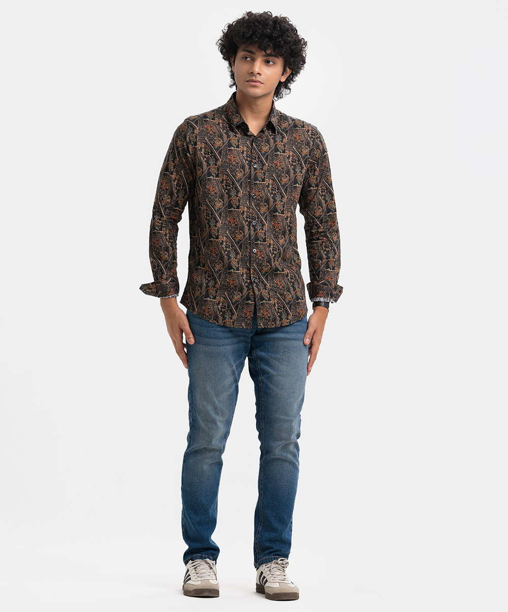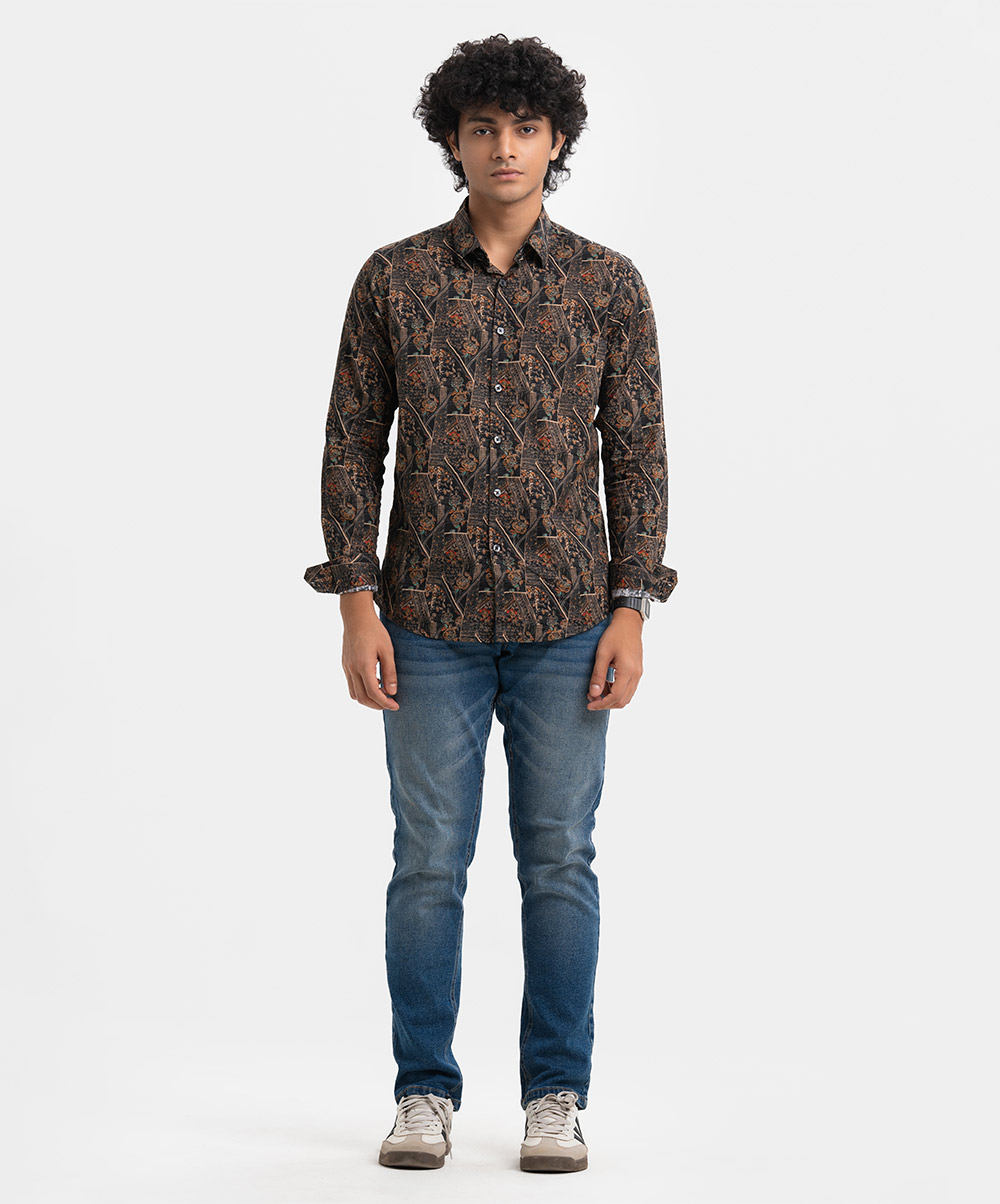 Men’s printed casual shirt in cotton fabric. Classic collar, cuff sleeves. Buttons fasten at the front.