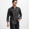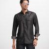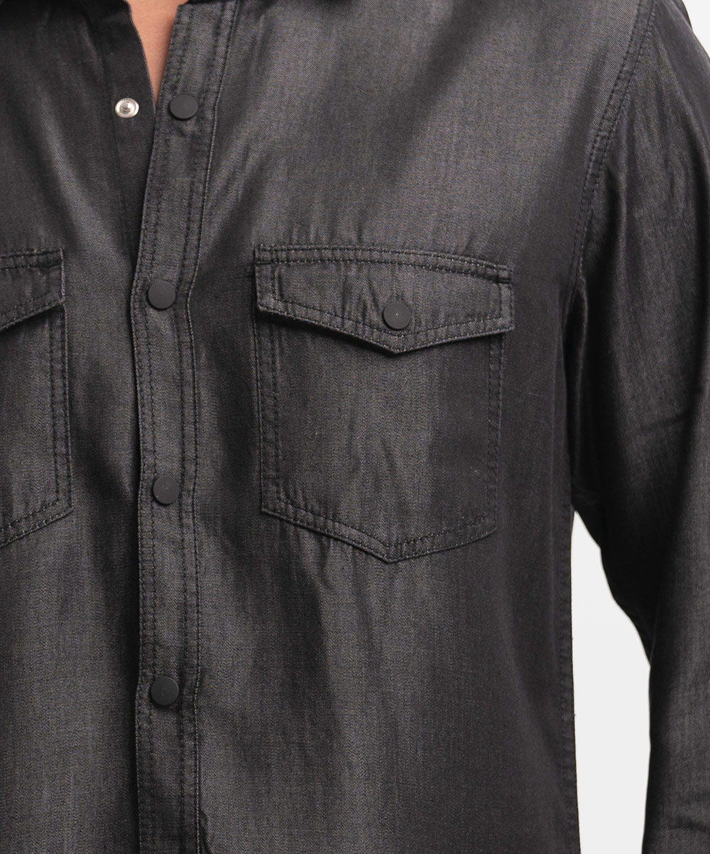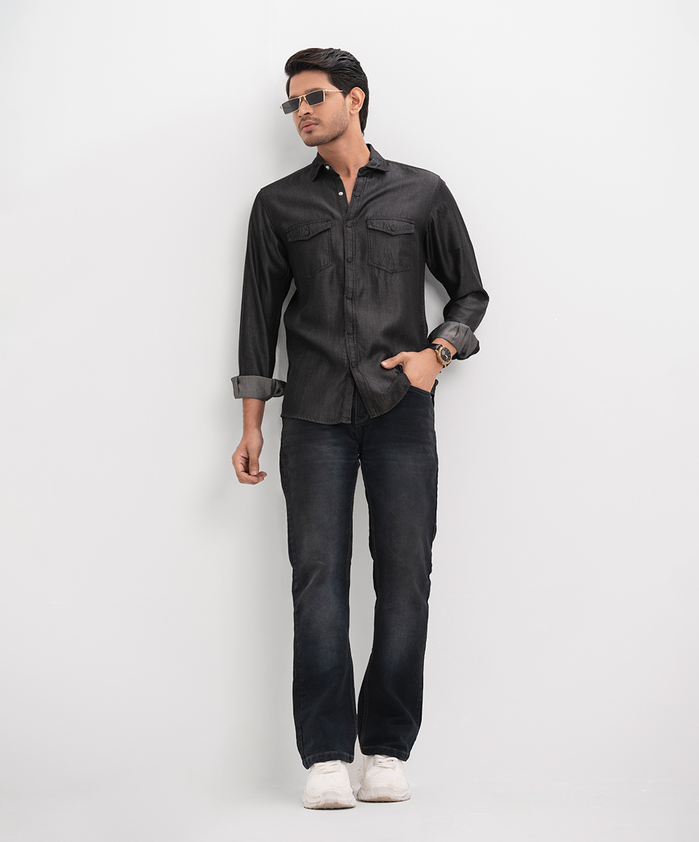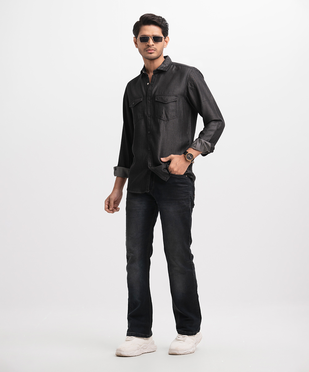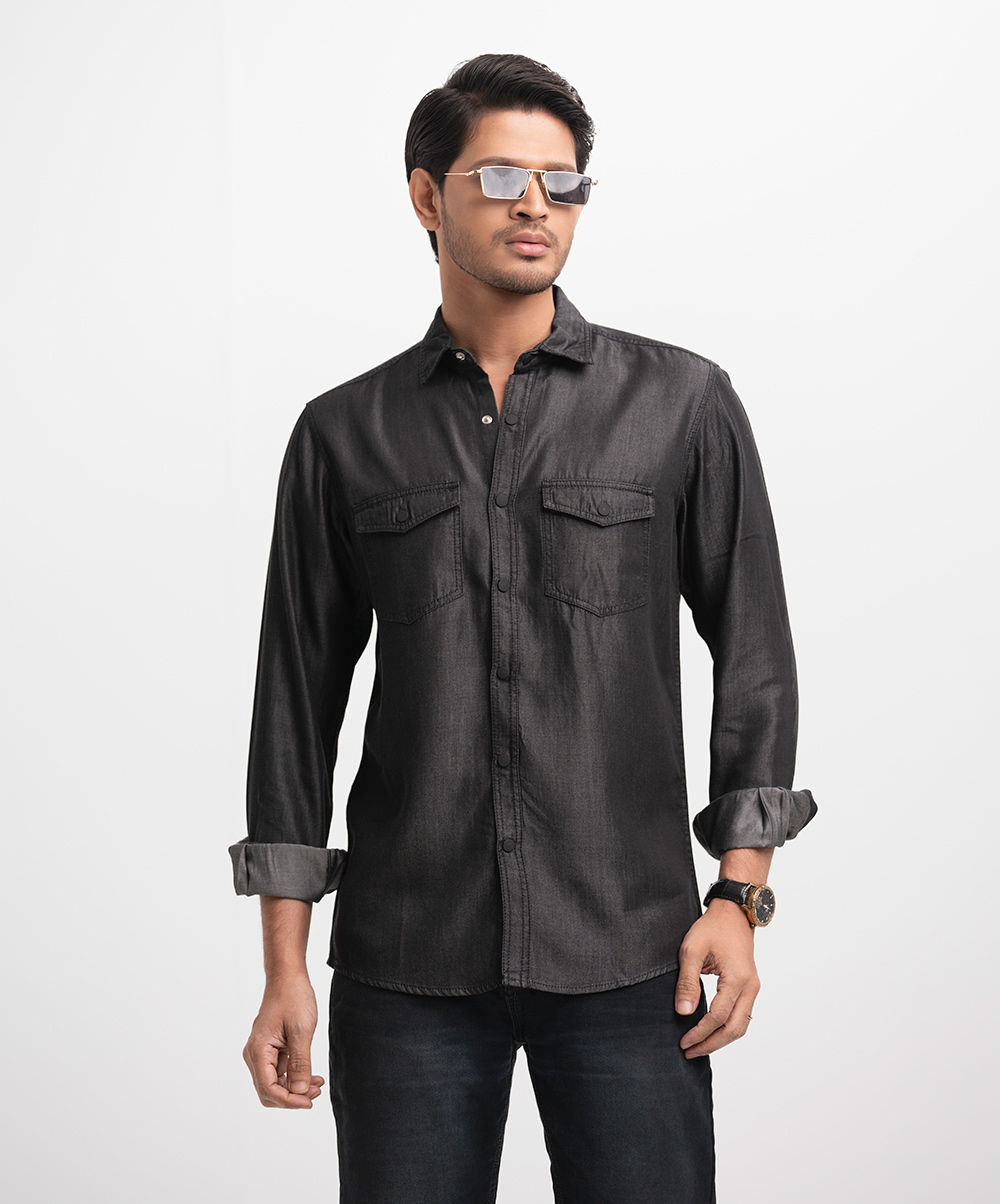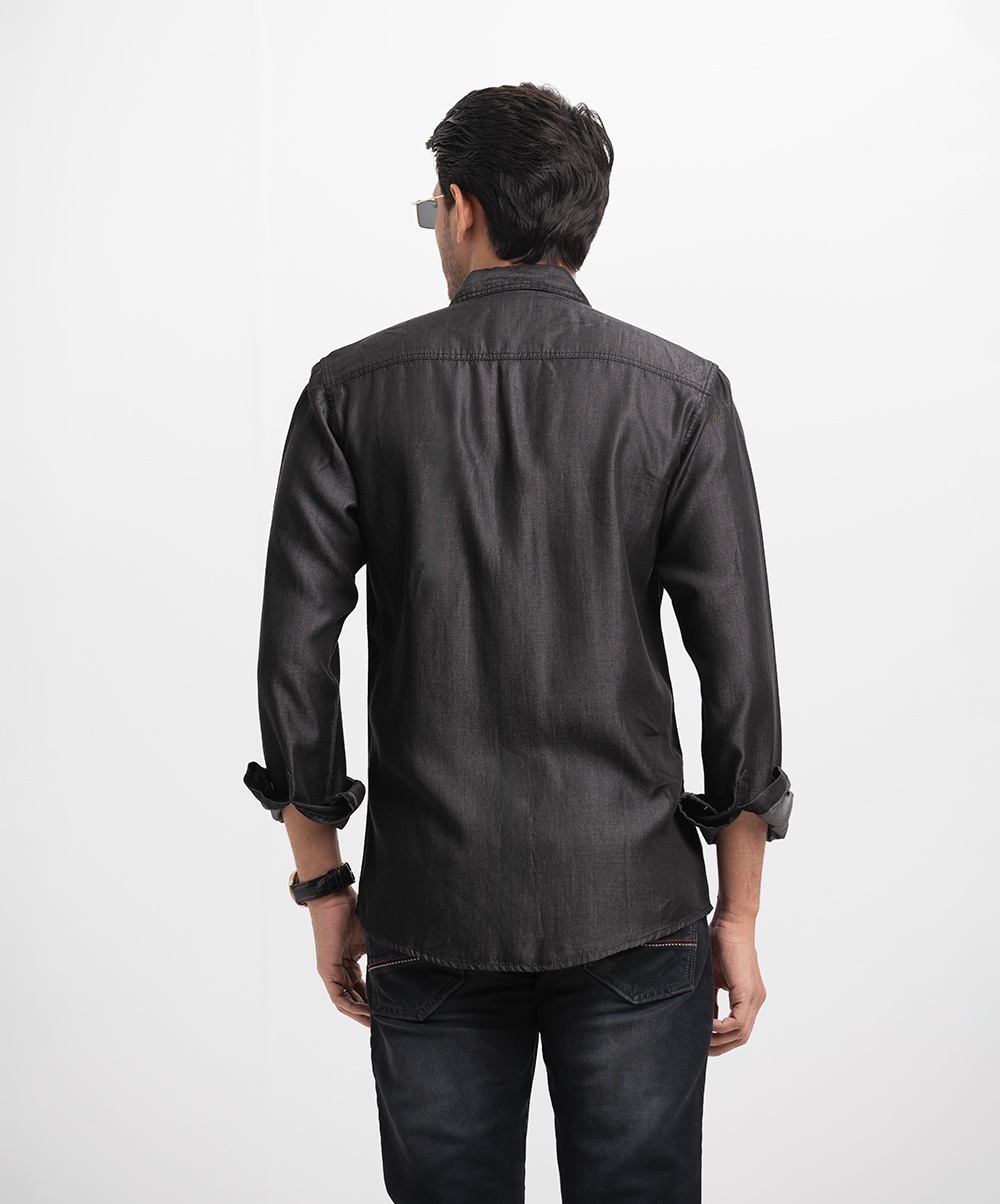 Men’s single color casual shirt in washed denim fabric. Classic collar, full sleeves and two front pockets.