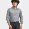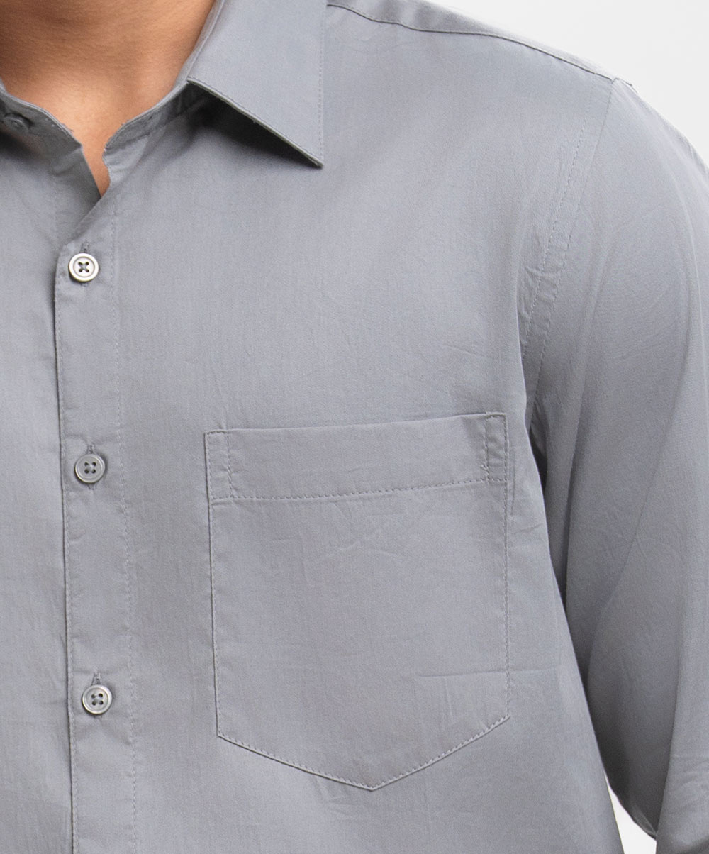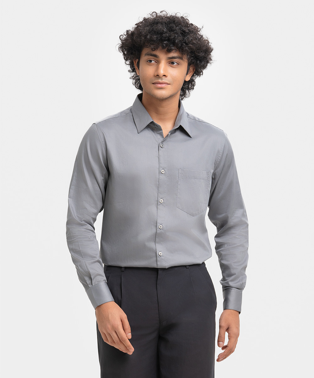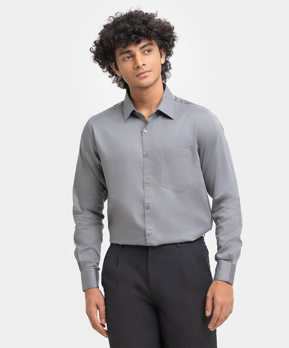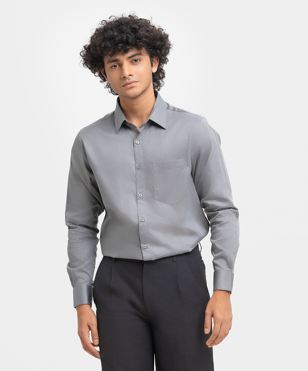 Long-sleeved single color formal shirt in cotton fabric. Classic collar with a chest pocket.