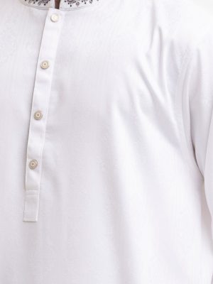 Men’s semi fitted panjabi in jacquard fabric. Mandarin collar with hidden metal buttons on the placket & full sleeves. Inseam pockets.