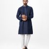 Blue fitted Panjabi in jacquard Cotton fabric. Designed with embroidery on the collar and hidden button placket.