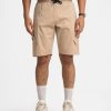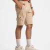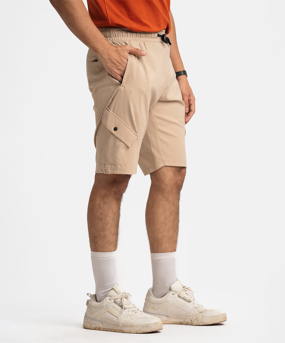 Soft brown Bermuda pant in stretchable interlock knit fabric. Elasticated waist with an adjustable drawstring. Patch pockets on the side with extra flap pockets. Single zipper-close patch pocket on the back.