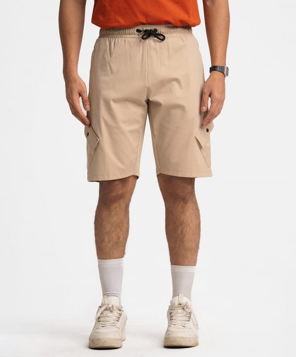 Soft brown Bermuda pant in stretchable interlock knit fabric. Elasticated waist with an adjustable drawstring. Patch pockets on the side with extra flap pockets. Single zipper-close patch pocket on the back.