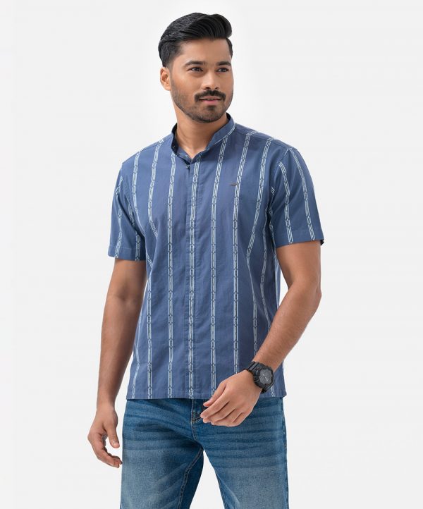 Men’s striped casual shirt in textured cotton fabric. Mandarin collar with two show buttons and short sleeves.