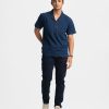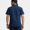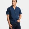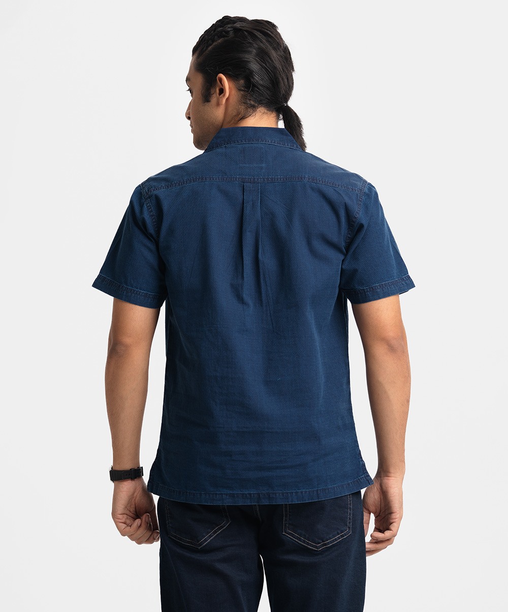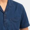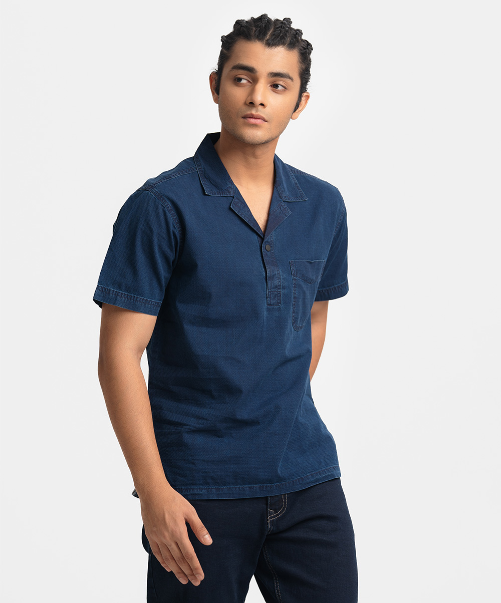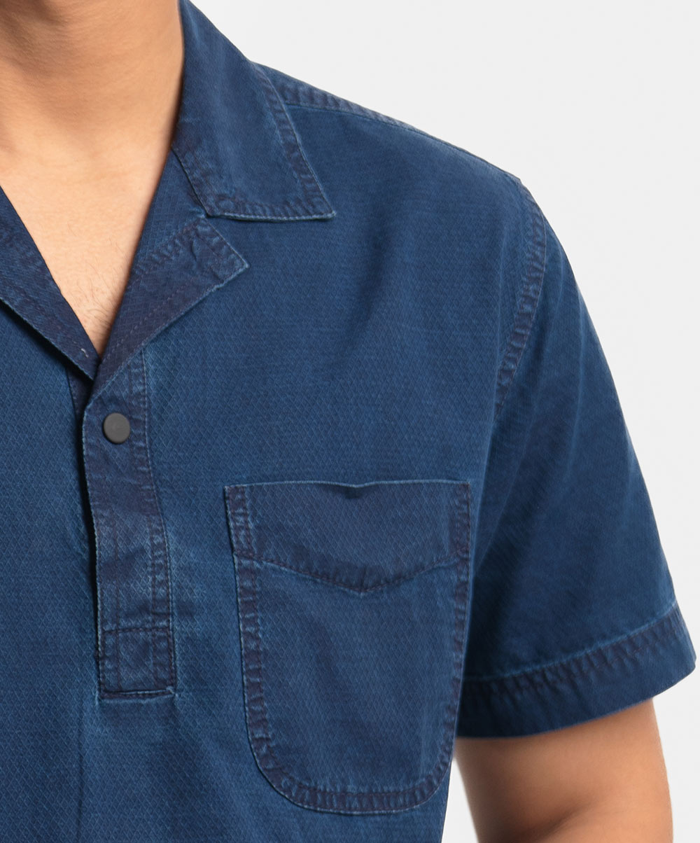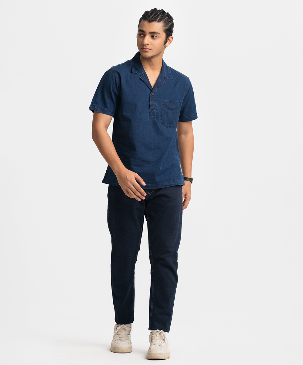 Cuban collar casual shirt in cotton chambray fabric. Short-sleeved, single chest pocket on the chest.