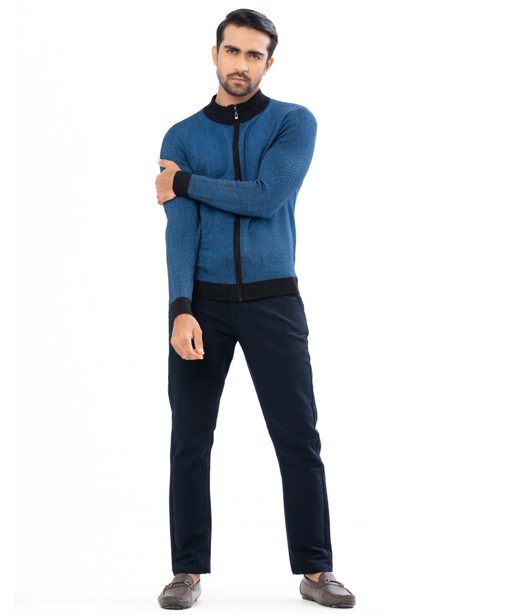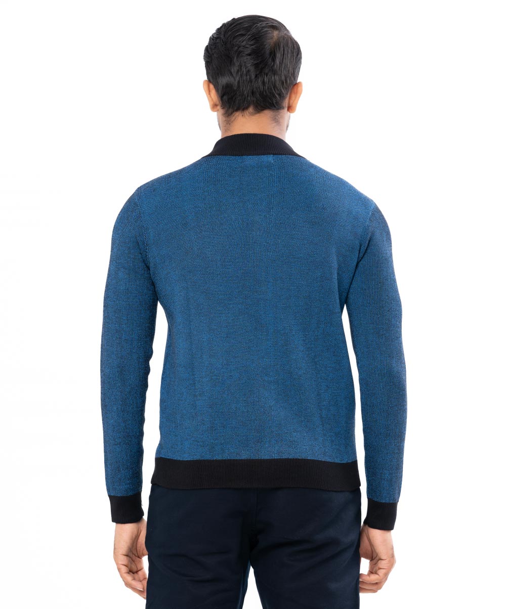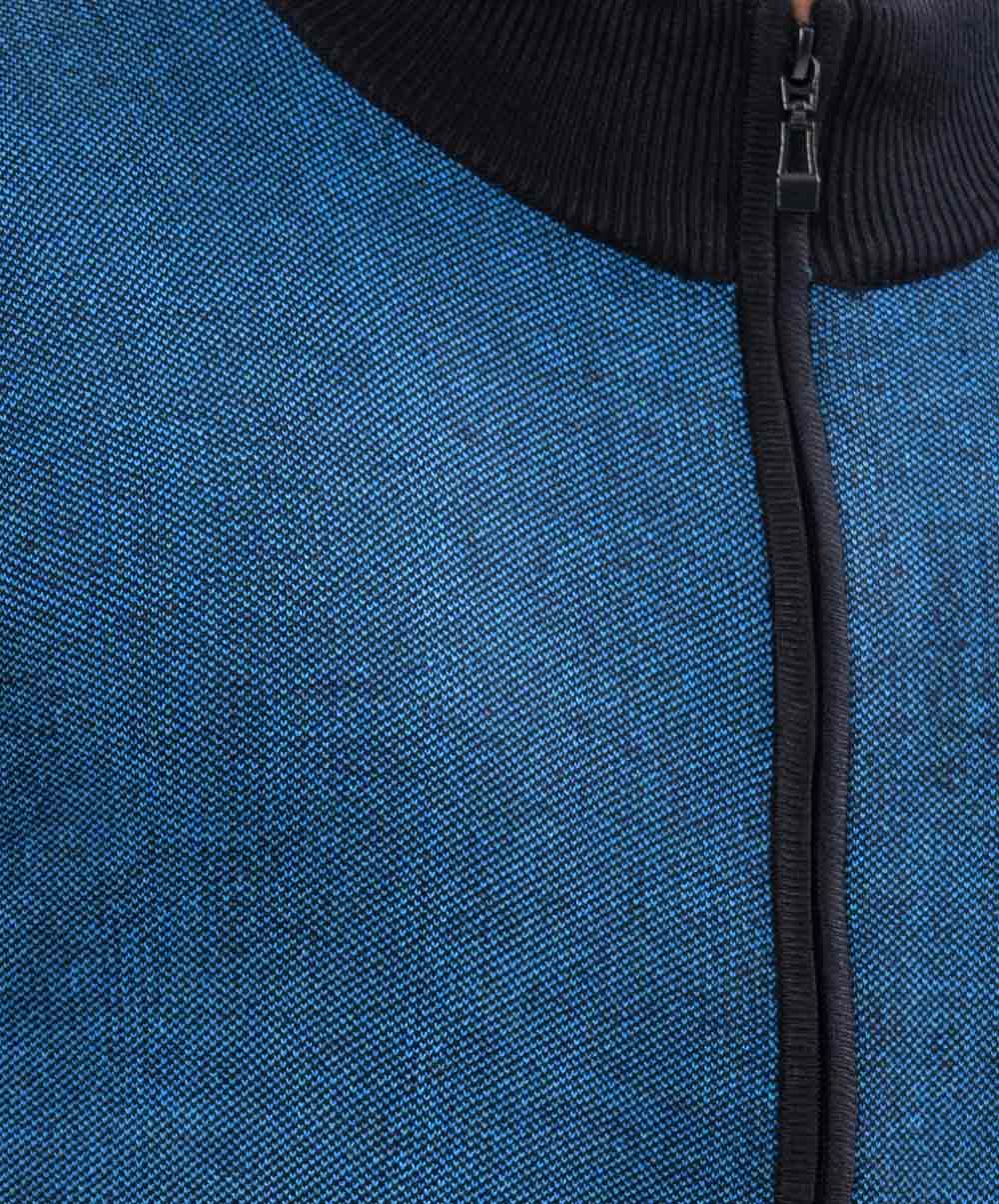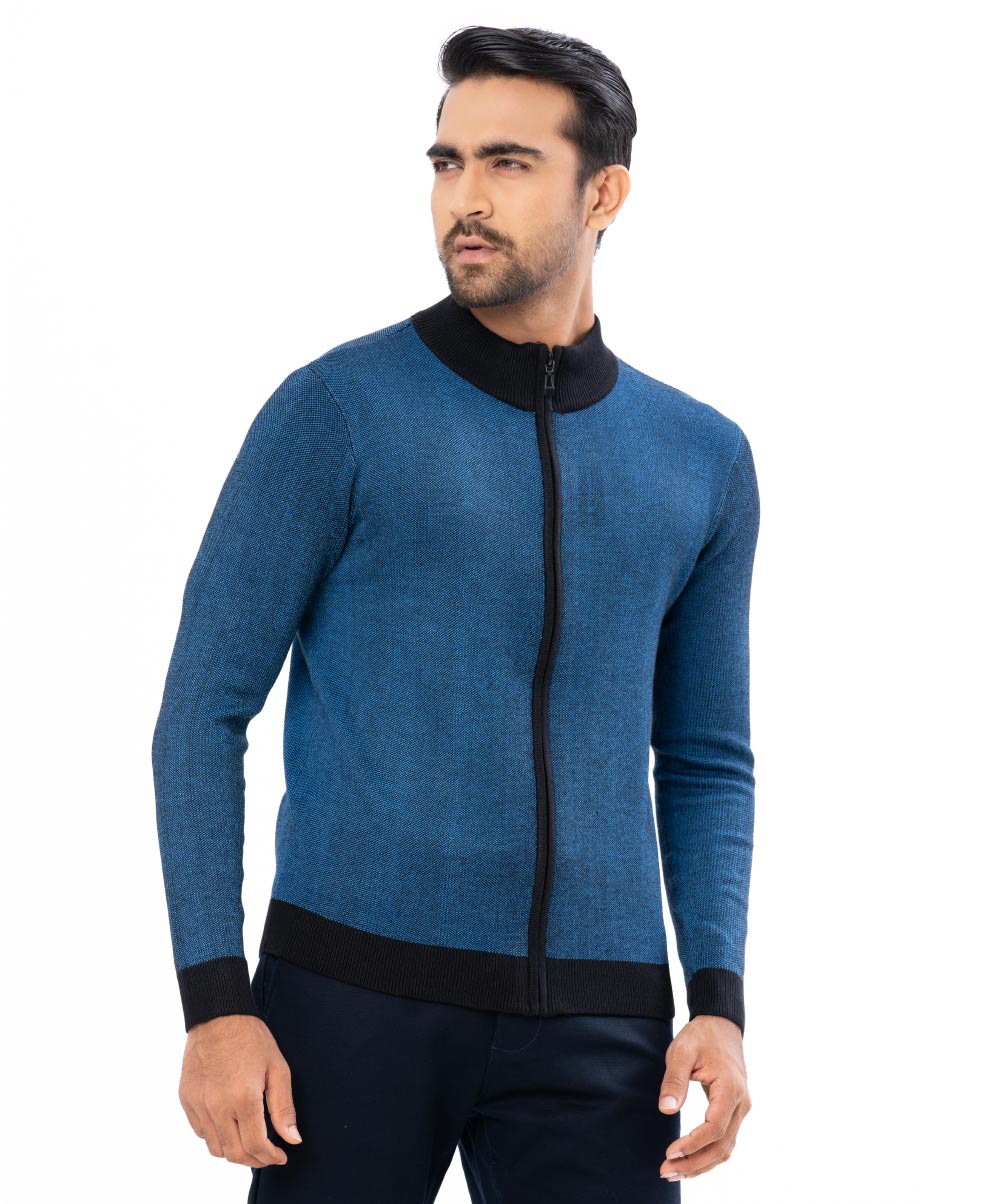 Blue Sweater in Cotton knit fabric. High-neck and long sleeves. Ribbed neckline, cuffs, and hem. Zipper closure at the front.
