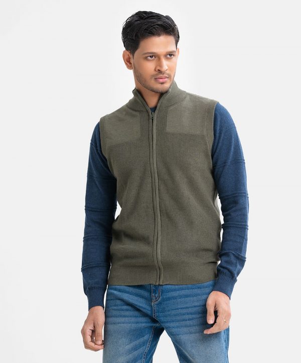 Men’s winter sweater in blended cotton knit fabric. Stand-up collar, sleeveless, front zipper and a straight hem. Featuring narrow ribbing at the collar, cuffs, and hem.