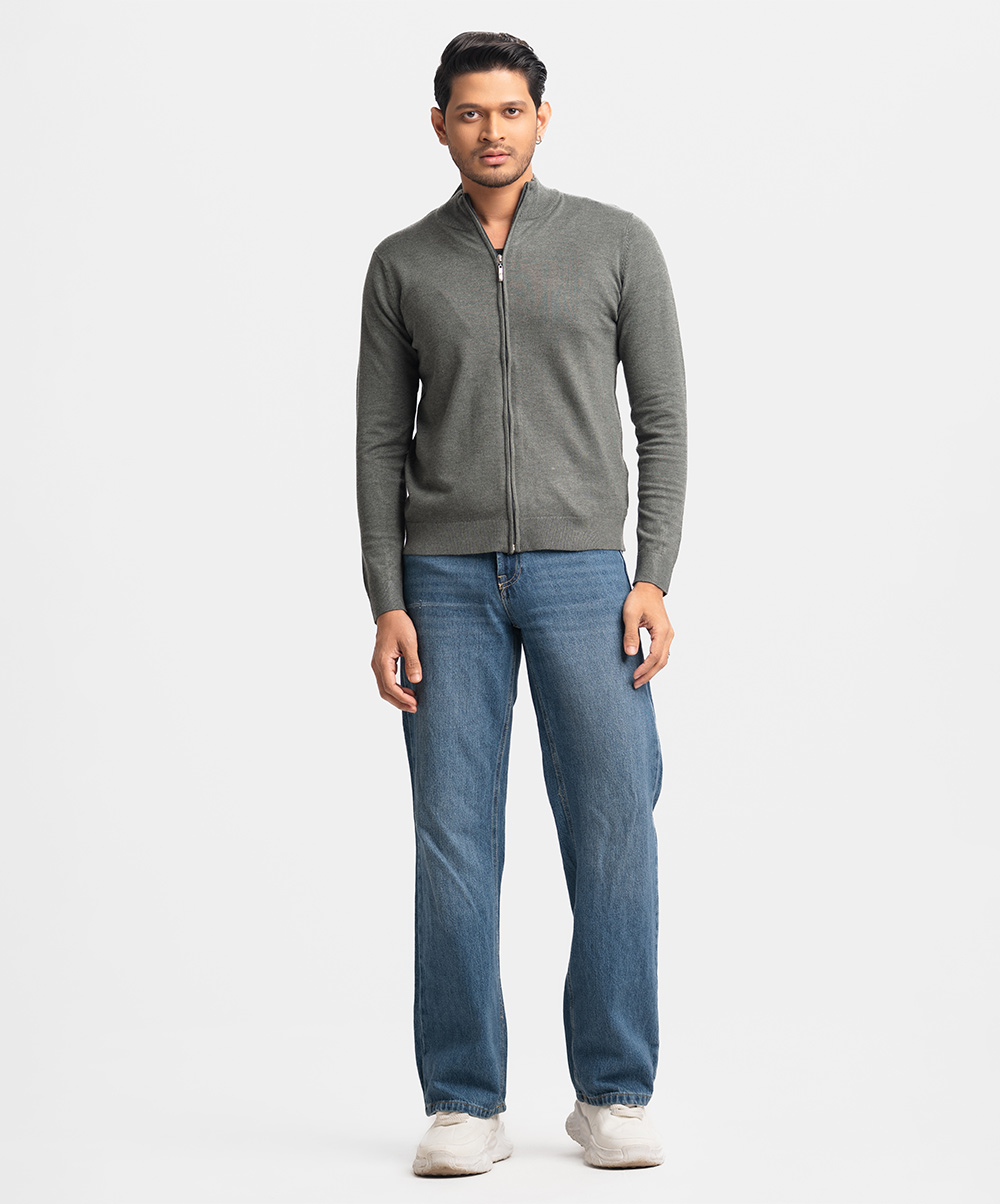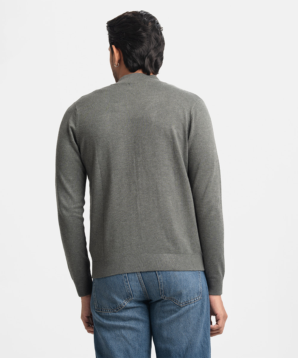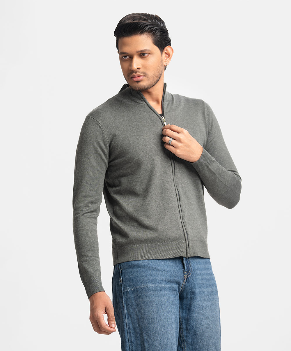 Men’s winter woven sweater in blended viscose knit fabric. High collar, full sleeves, and zip-up front. Featuring narrow ribbing at the collar, cuffs and hem.
