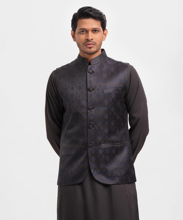Men’s waistcoat in Jacquard fabric. Mandarin collar, sleeveless, straight hem with buttons closure and three pockets at front.