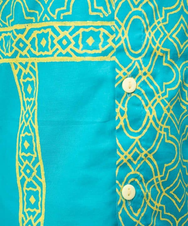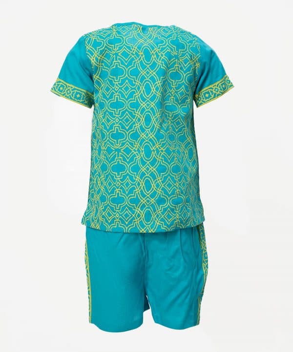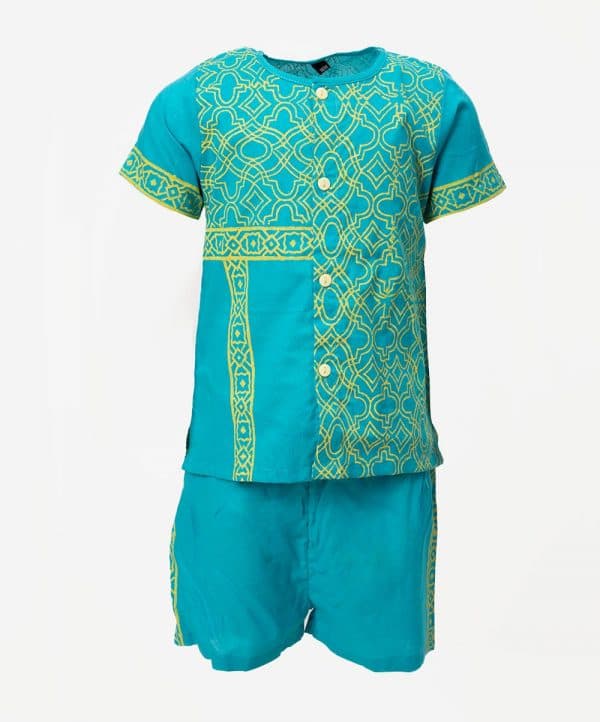 Newborn baby boys’ printed fotua pant set in cotton fabric. Round neck, short-sleeves and button fastening. Paired with a short pant.