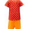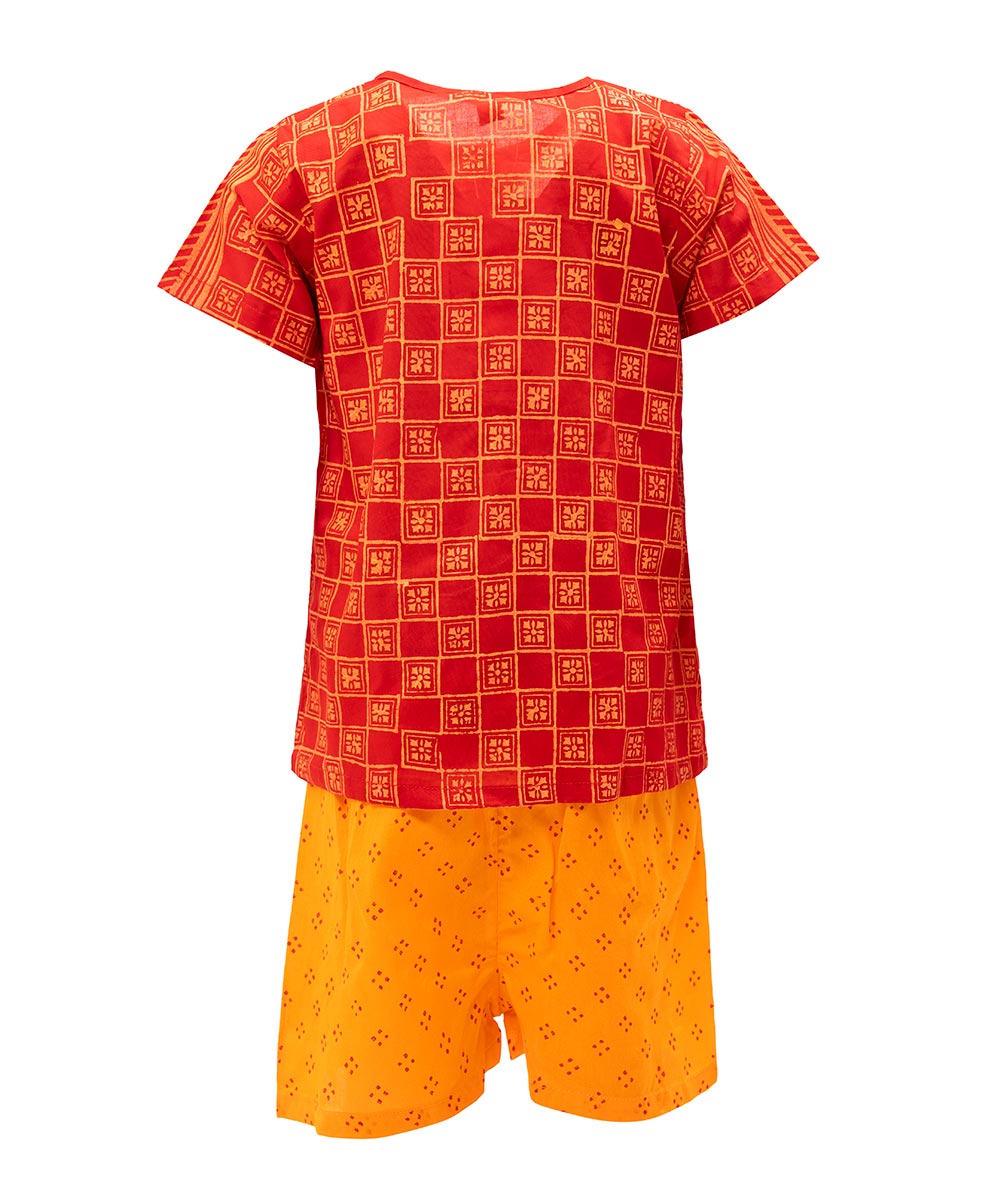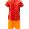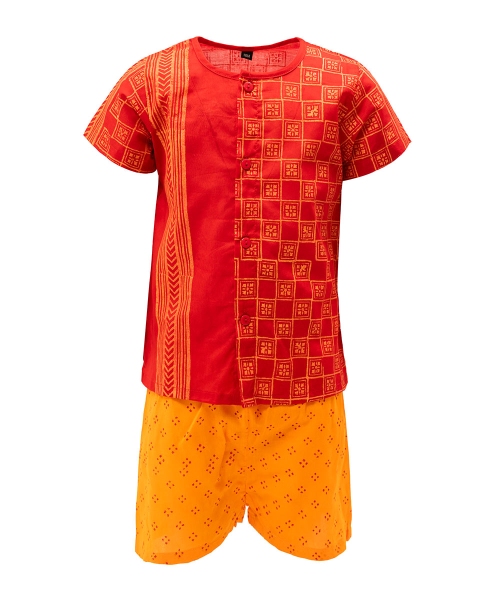 Newborn baby boys’ printed fotua pant set in cotton fabric. Round neck, short-sleeved, and button fastening at the front. Paired with a baby pant.