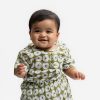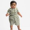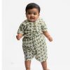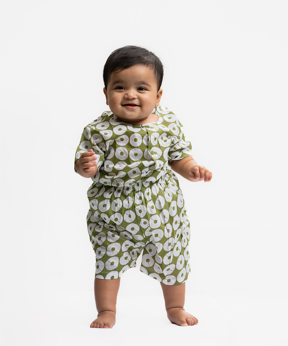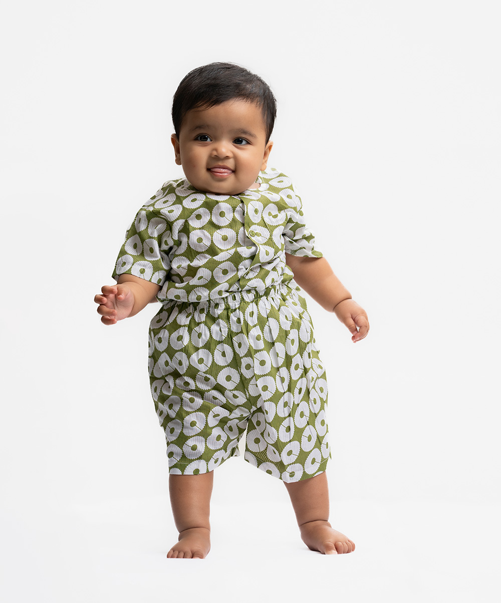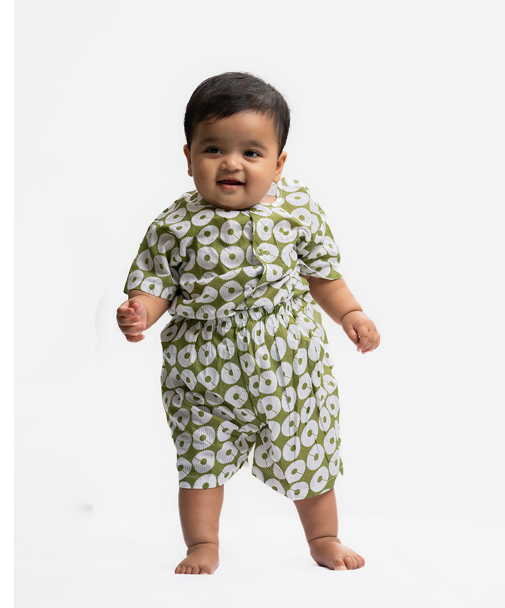 Newborn baby boys’ printed fotua pant set in cotton fabric. Round neck, short-sleeves and button fastening with a front pocket. Paired with a short pant.