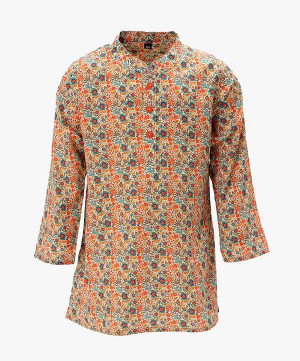 Newborn baby boy’s printed panjabi in cotton fabric. Mandarin collar and inseam pockets.