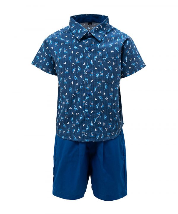 Newborn baby boy’s printed shirt pants set in cotton fabric. Classic collar, short sleeves, a chest pocket shirt & short pants.