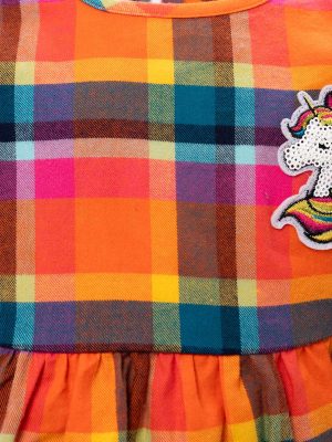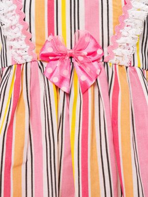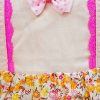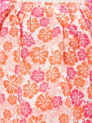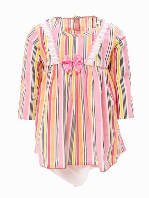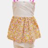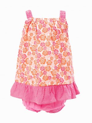 New born girls printed frock and pant set in cotton fabric. Sleeveless, gathered waist and lace work at front.