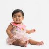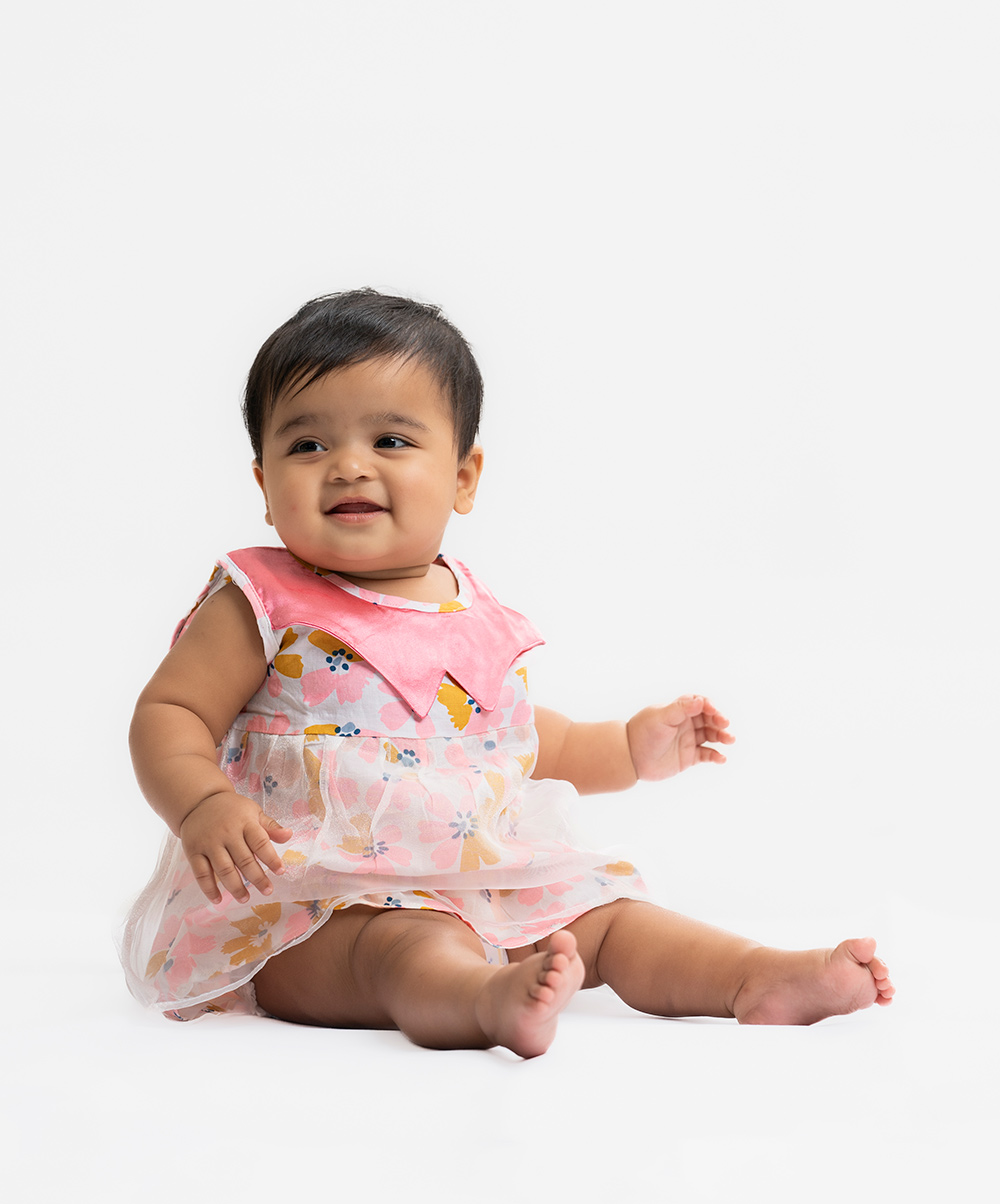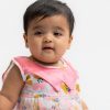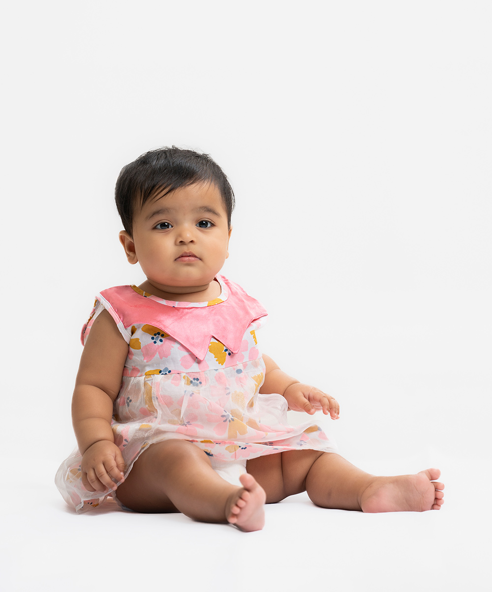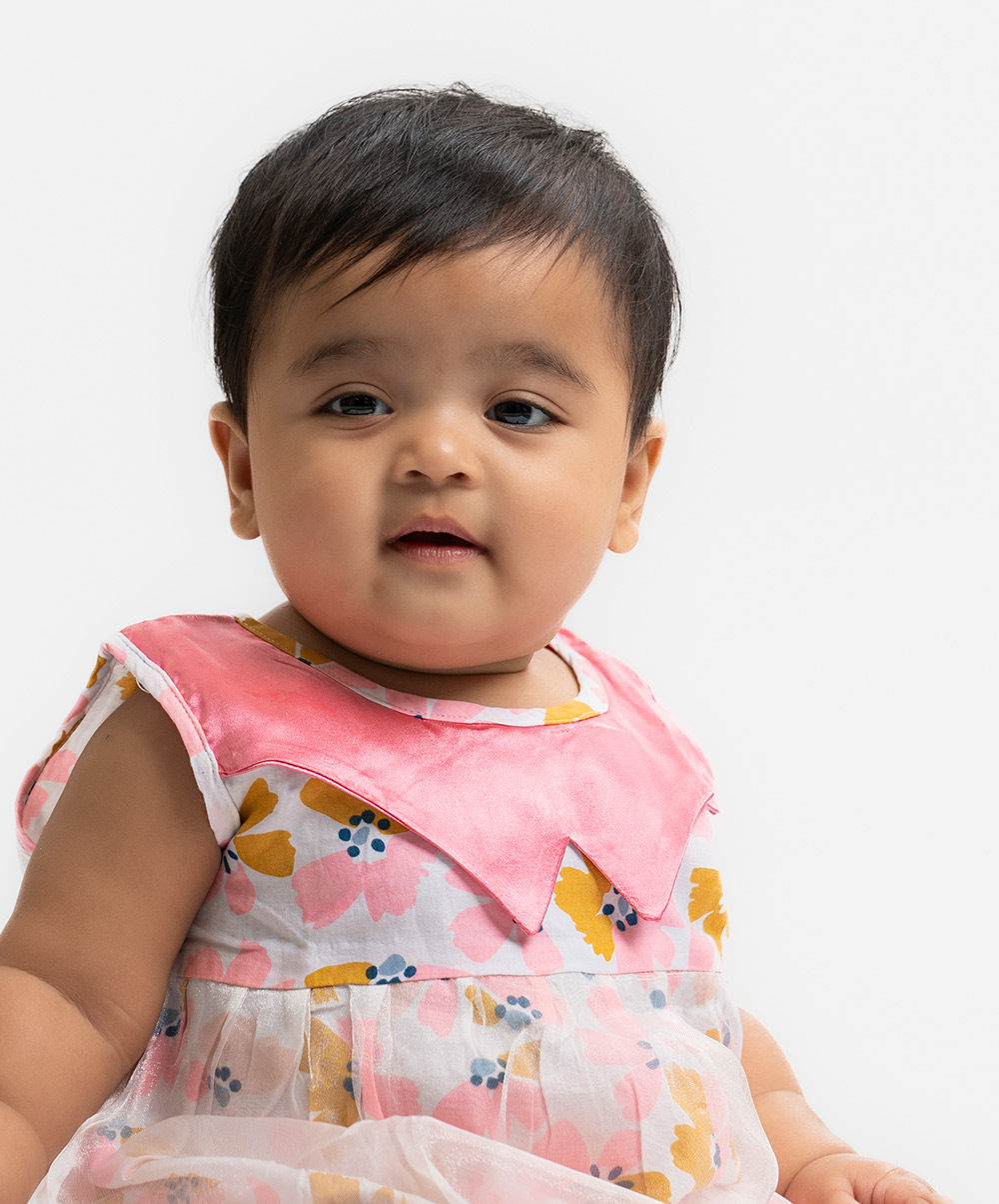 Newborn baby girls printed frock & pant set in cotton fabric. Sleeveless, round collar and patch at front.