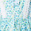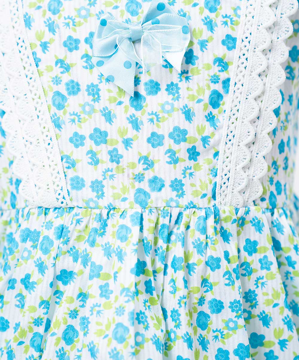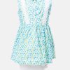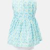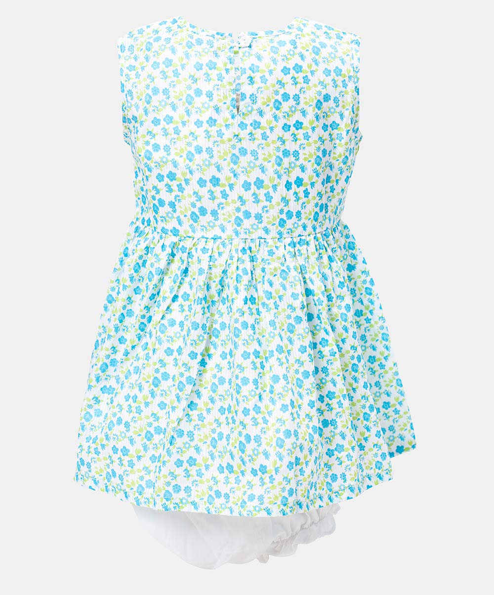 Newborn baby girls printed A-line frock & pant set in cotton fabric. Sleeveless, round neck. Lace and bow at front.
