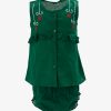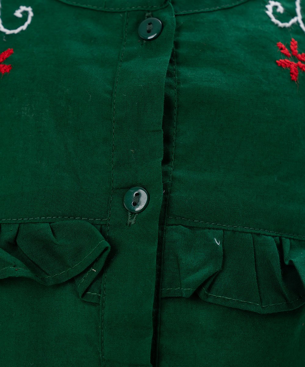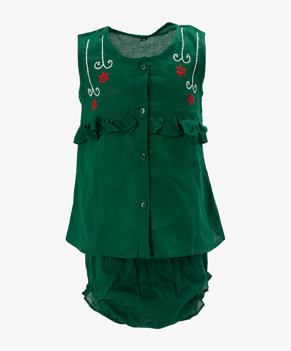 Newborn baby girls’ nima set in cotton fabric. Round neck, sleeveless. Karchupi and button fastening at the front and frills at the waistline. paired with a baby pant.