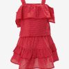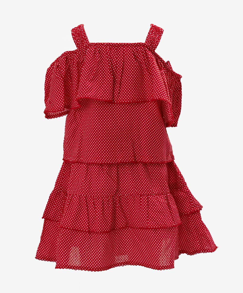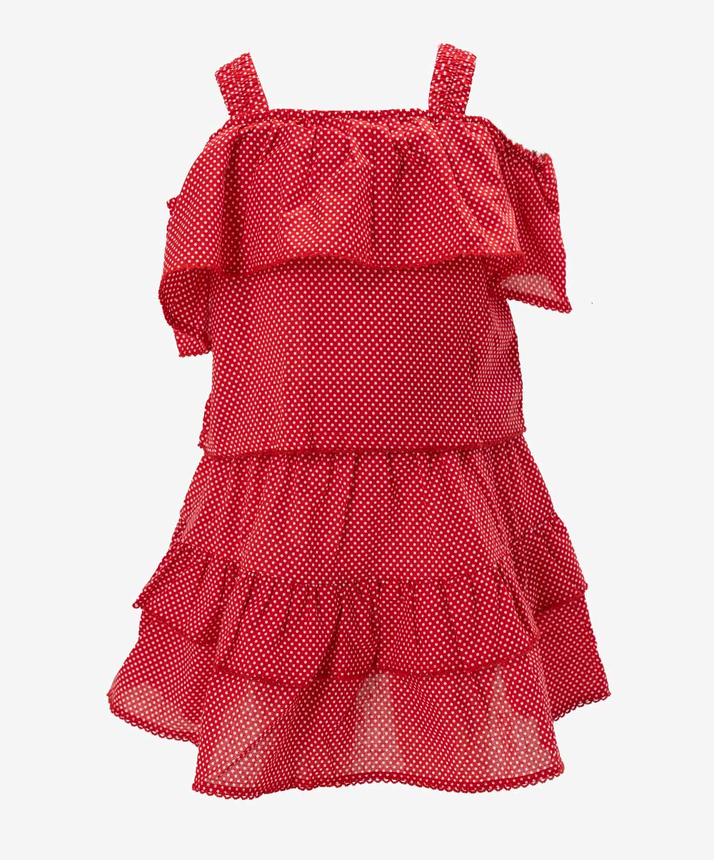 Newborn girl’s polka dot printed skirt tops set in cotton fabric. Off-shoulder strap top and circular hem skirts.