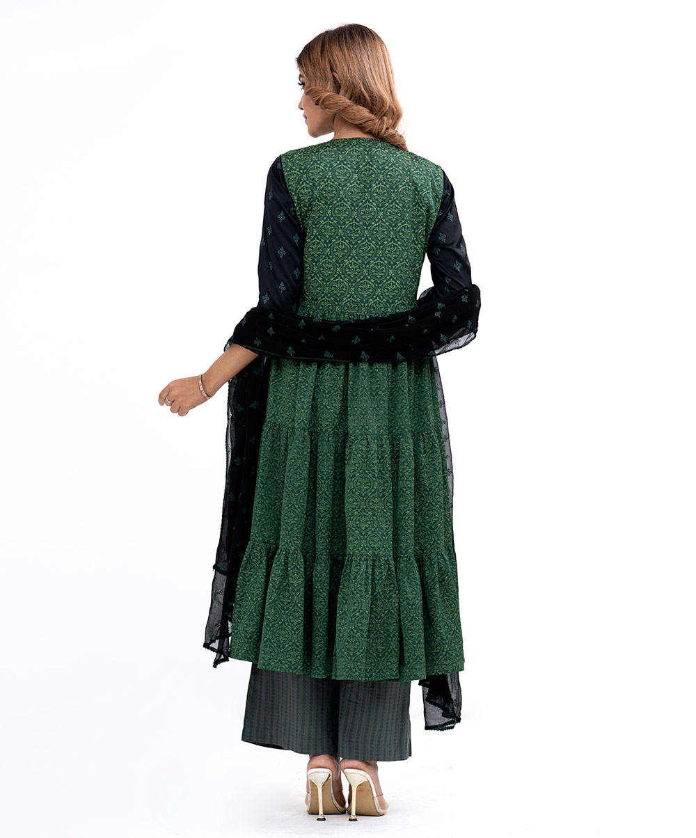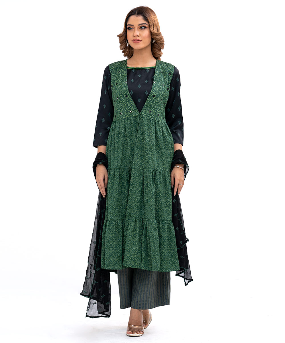 All-over printed sleeve less tiered style shrug salwar kameez with short style inner. Karchupi on neckline with chiffon dupatta and pant salwar.