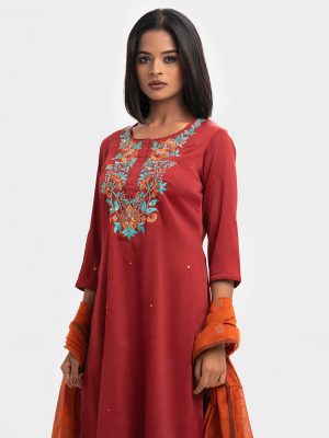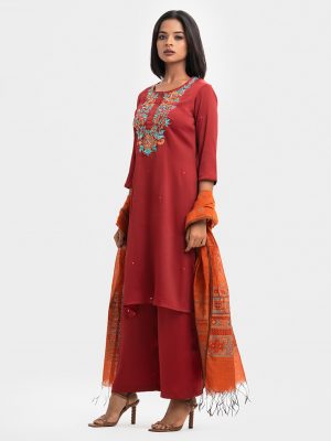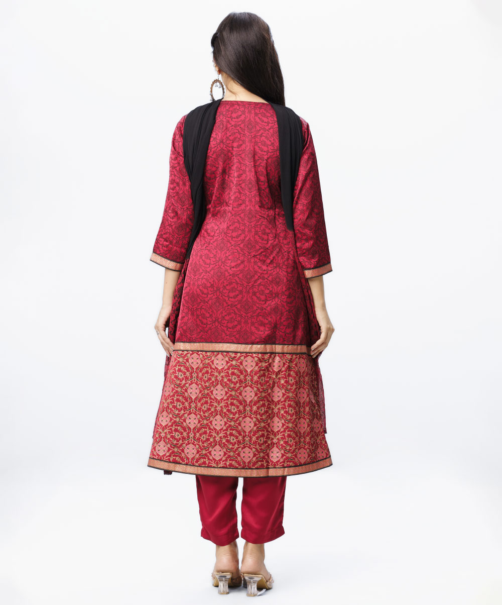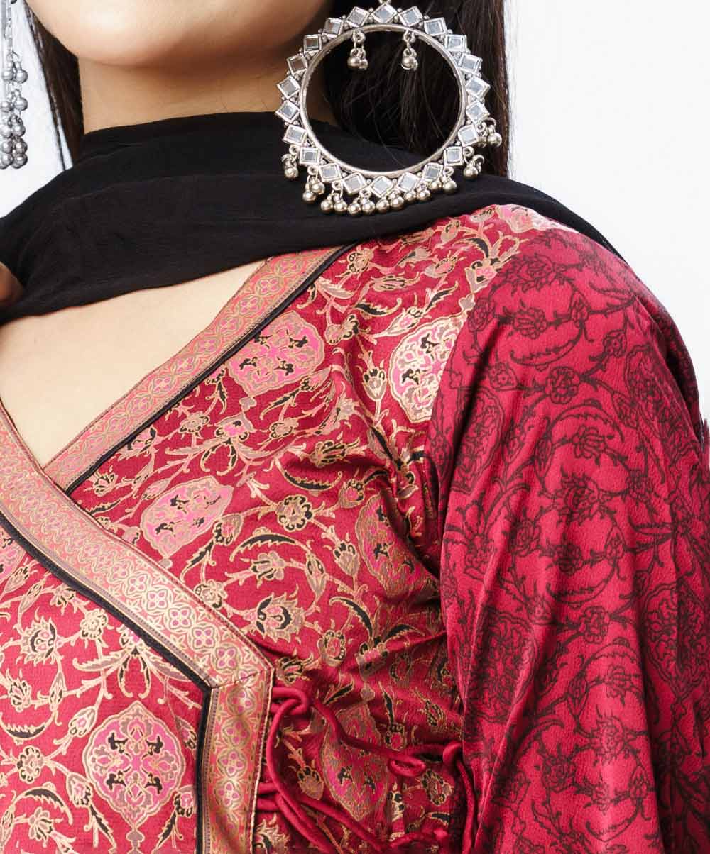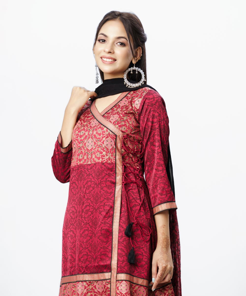 Maroon all-over printed retro-wrap style salwar kameez in Crepe fabric. The Kameez is designed with a V-neck and three-quarter sleeves. Corset cord at the front. Detailed with printed patch attachment at the front, cuffs and hemline. Complemented by culottes pants and printed chiffon dupatta.