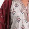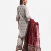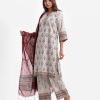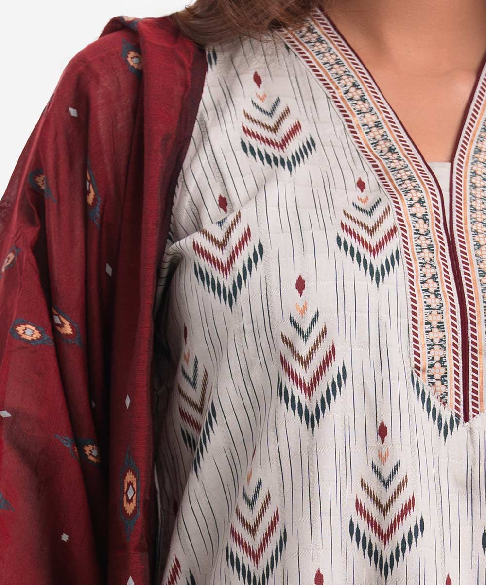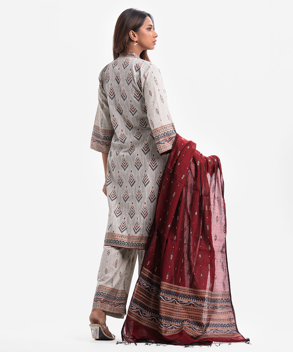 Women’s printed salwar kameez in Jacquard cotton fabric. V-neck, three-quarter sleeves and printed detail kameez. Comes with a half-silk dupatta and palazzo pants.