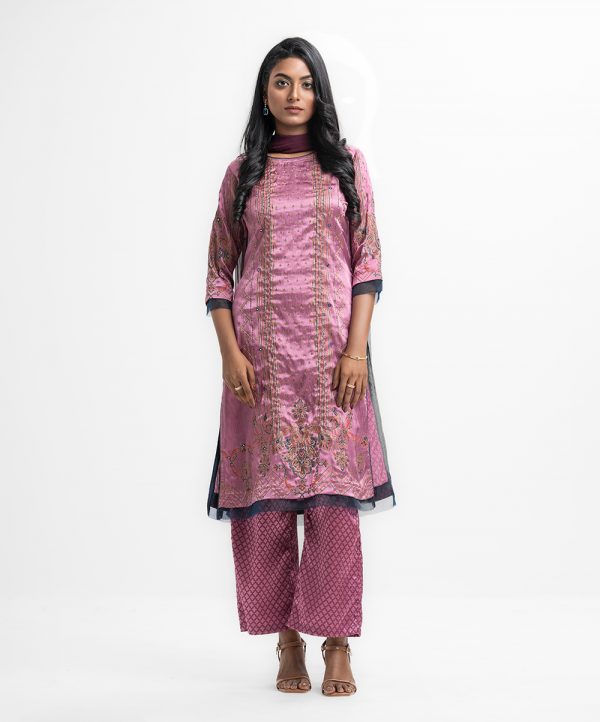 Round neck salwar kameez in crepe fabric. Three-quarter sleeves, karchupi details at the front. Complemented with a tie-dye chiffon dupatta and palazzo pants.