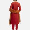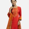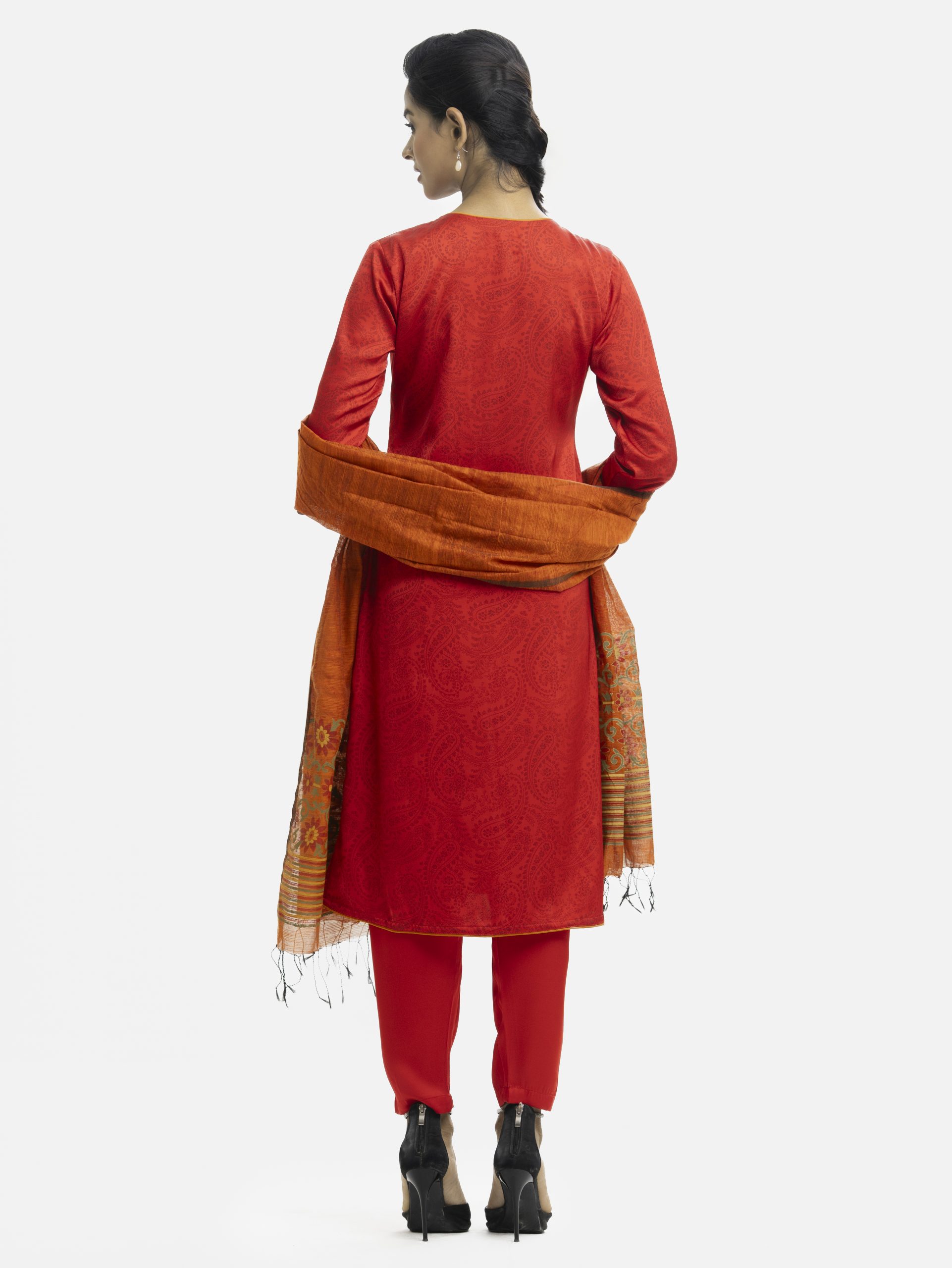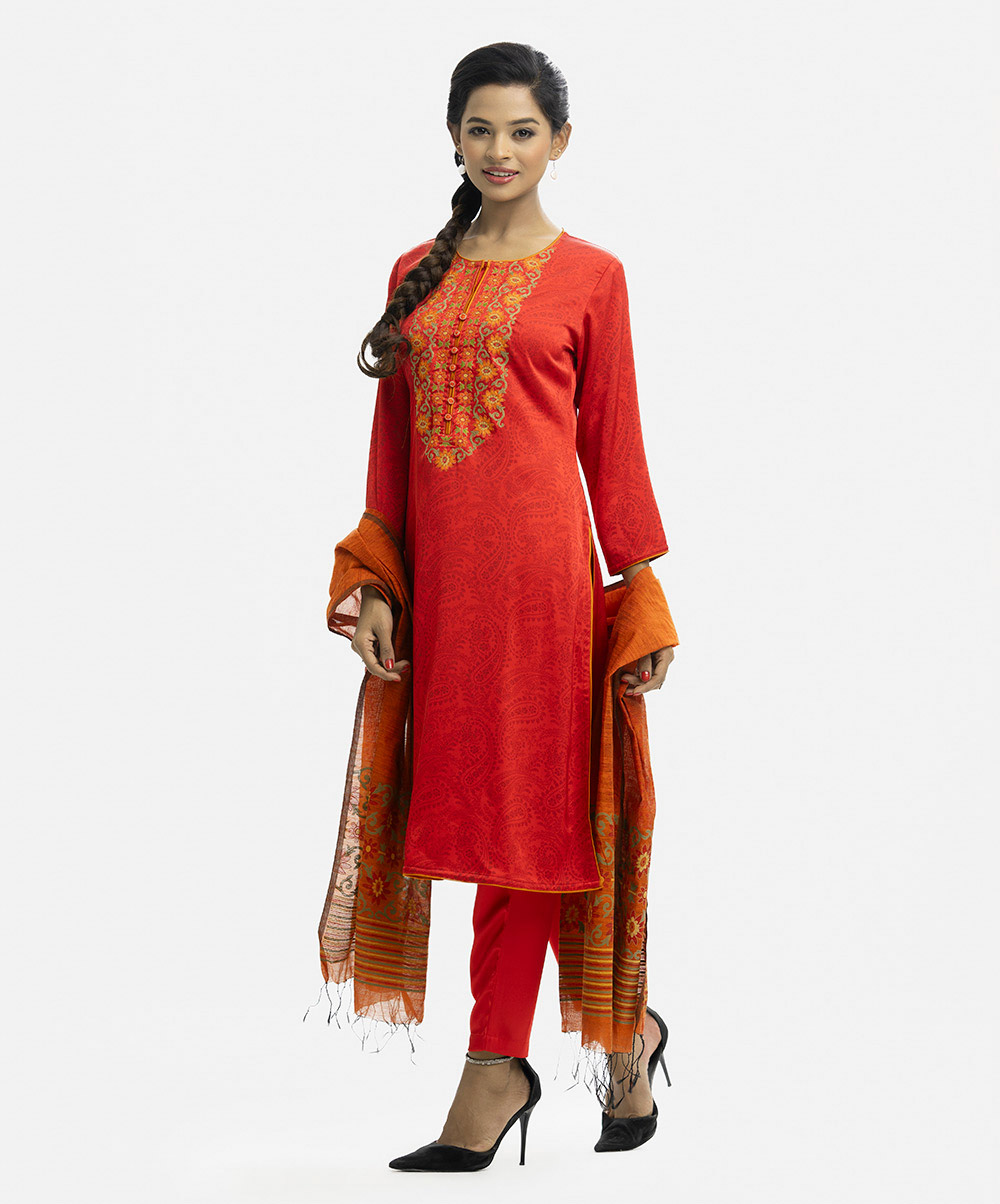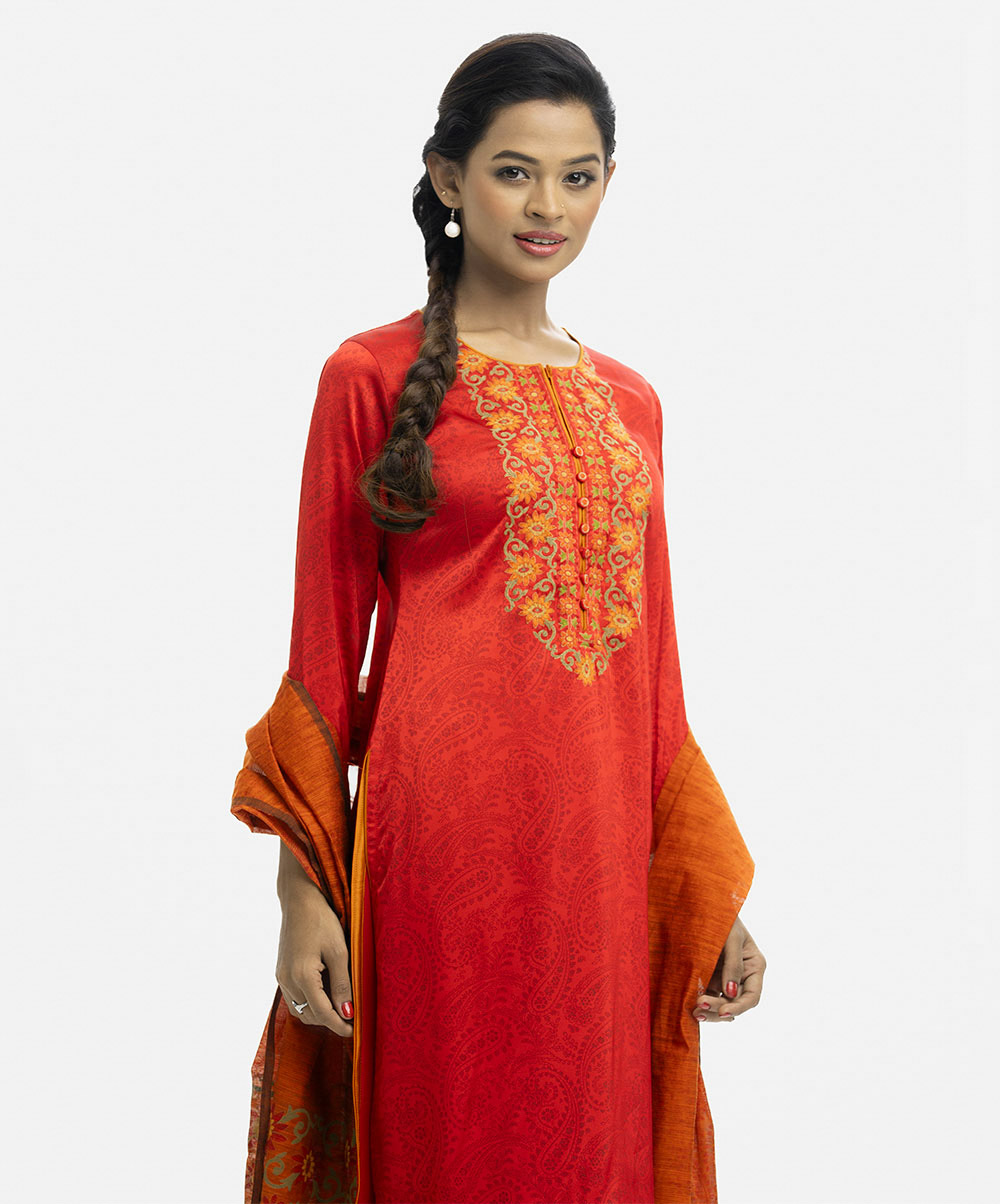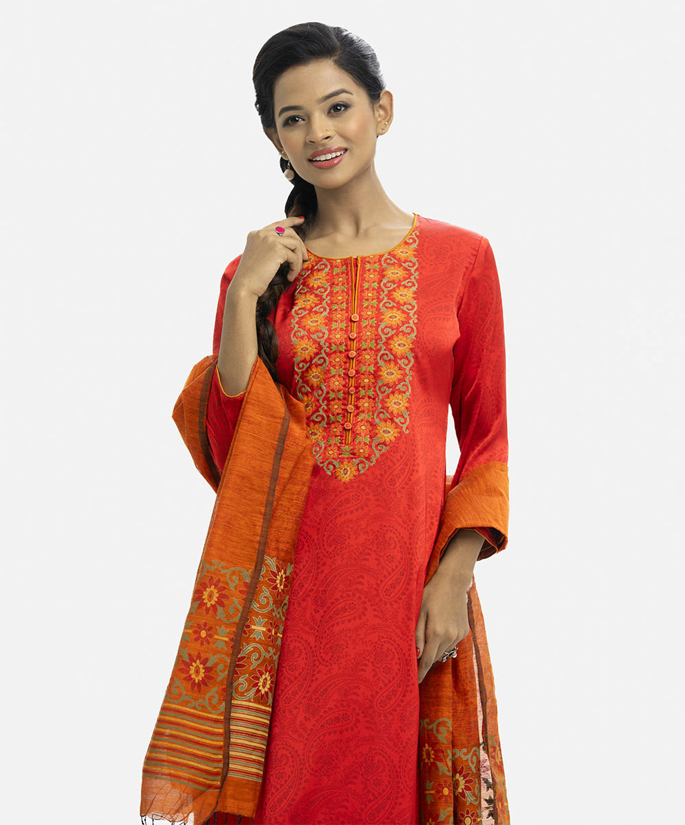 Women’s floral printed salwar kameez in georgette fabric. Round neck, three-quarter sleeves and embroidery at the front of kameez. Half-silk dupatta with pants-style pajama.
