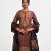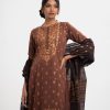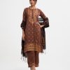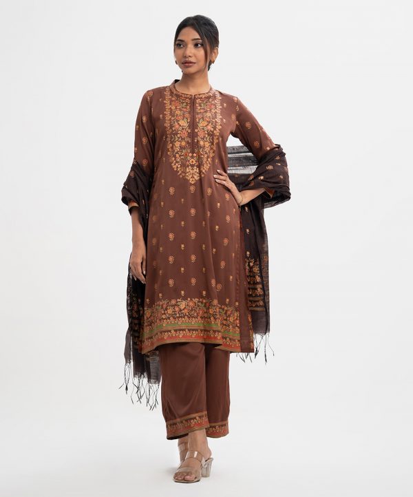 Band collar long salwar kameez in joom fabric. Long sleeves, karchupi details. Elasticated straight pants, half-silk dupatta.