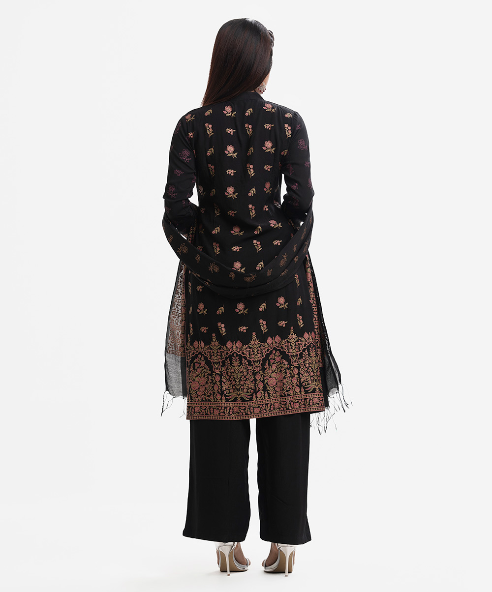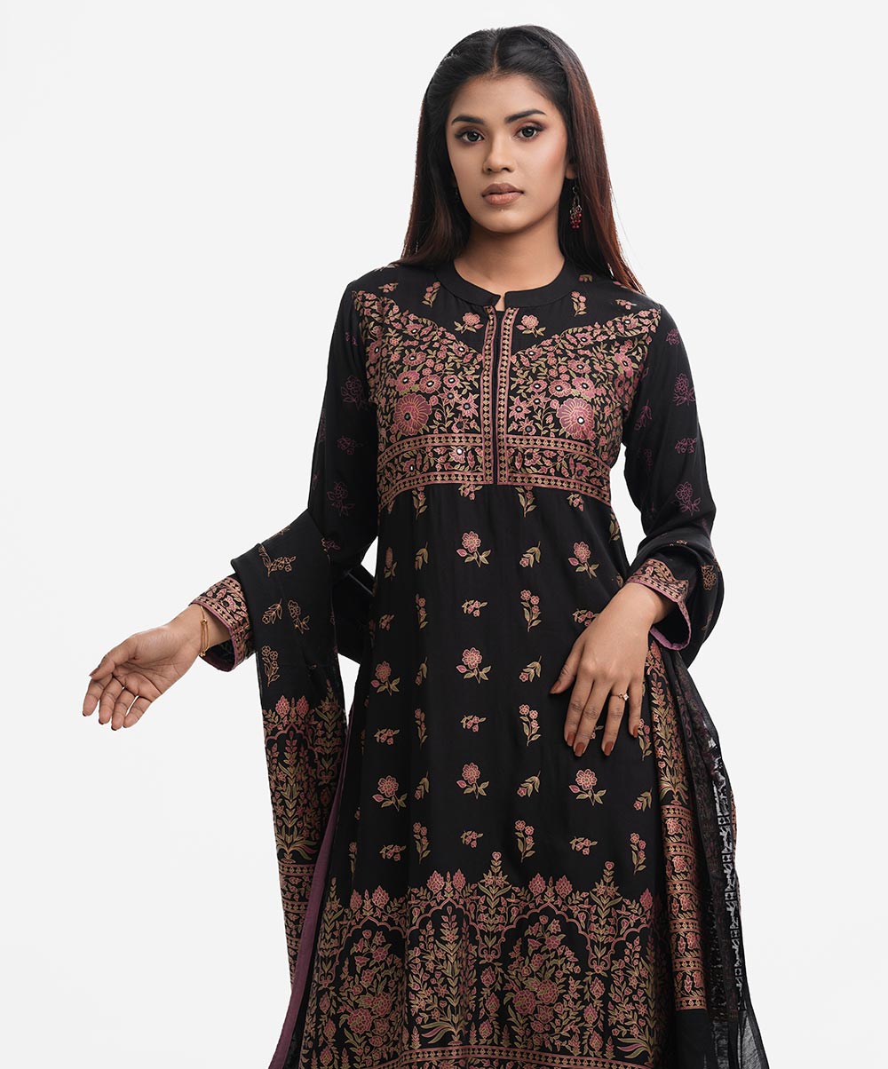 Women’s printed salwar kameez in viscose fabric. Mock neck, full sleeves and karchupi detail kameez. Palazzo pants and half-silk dupatta.