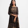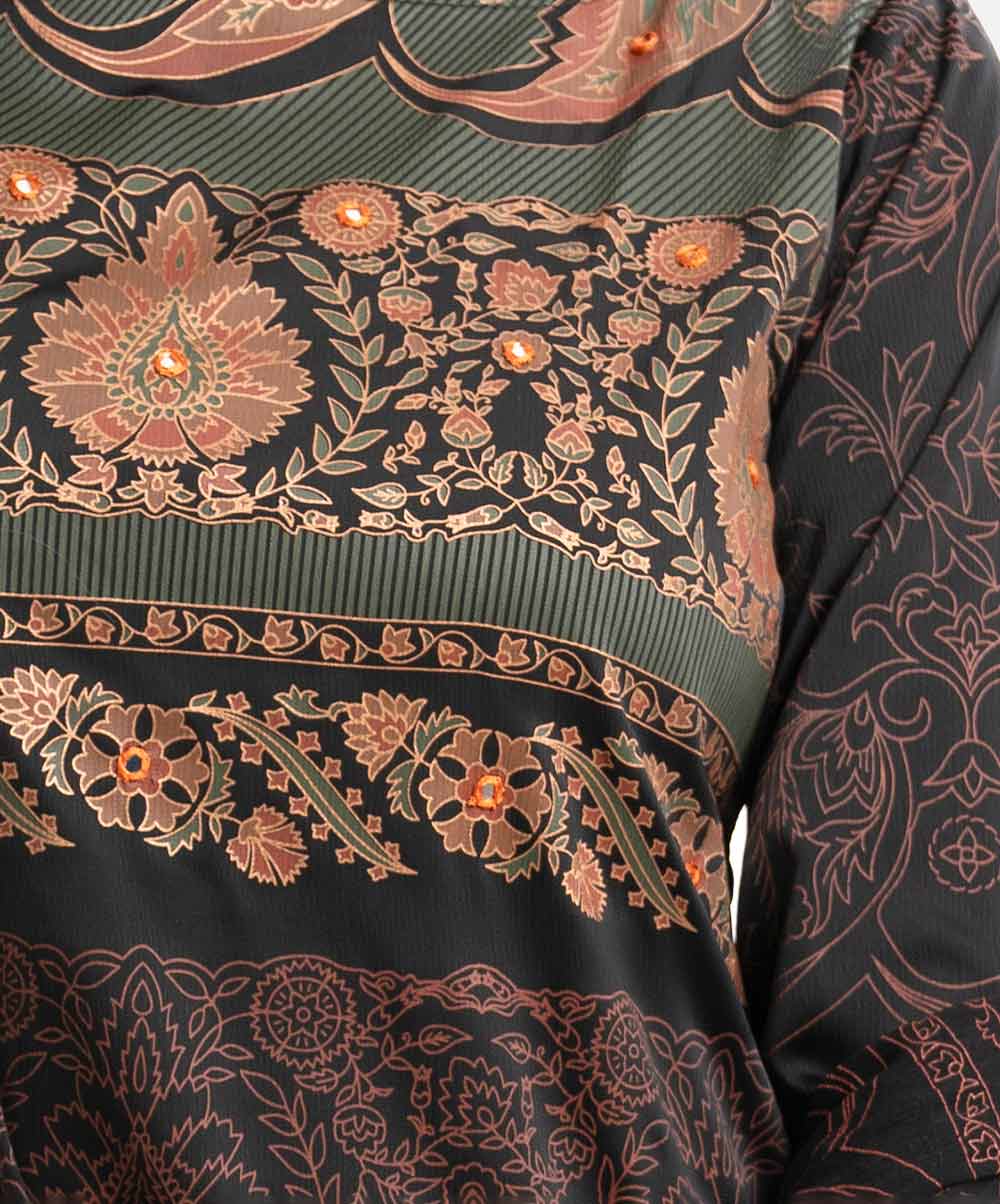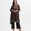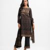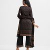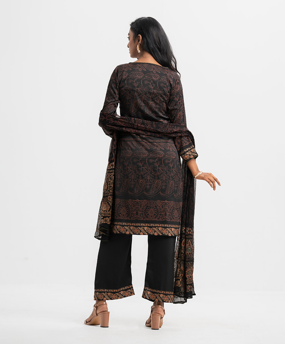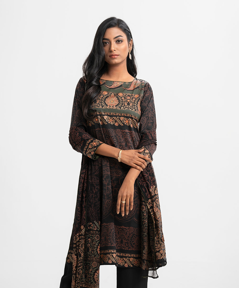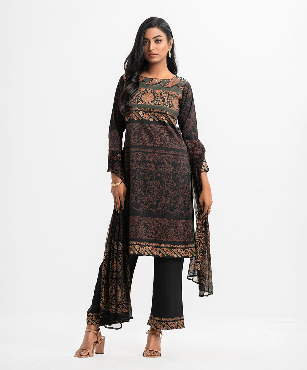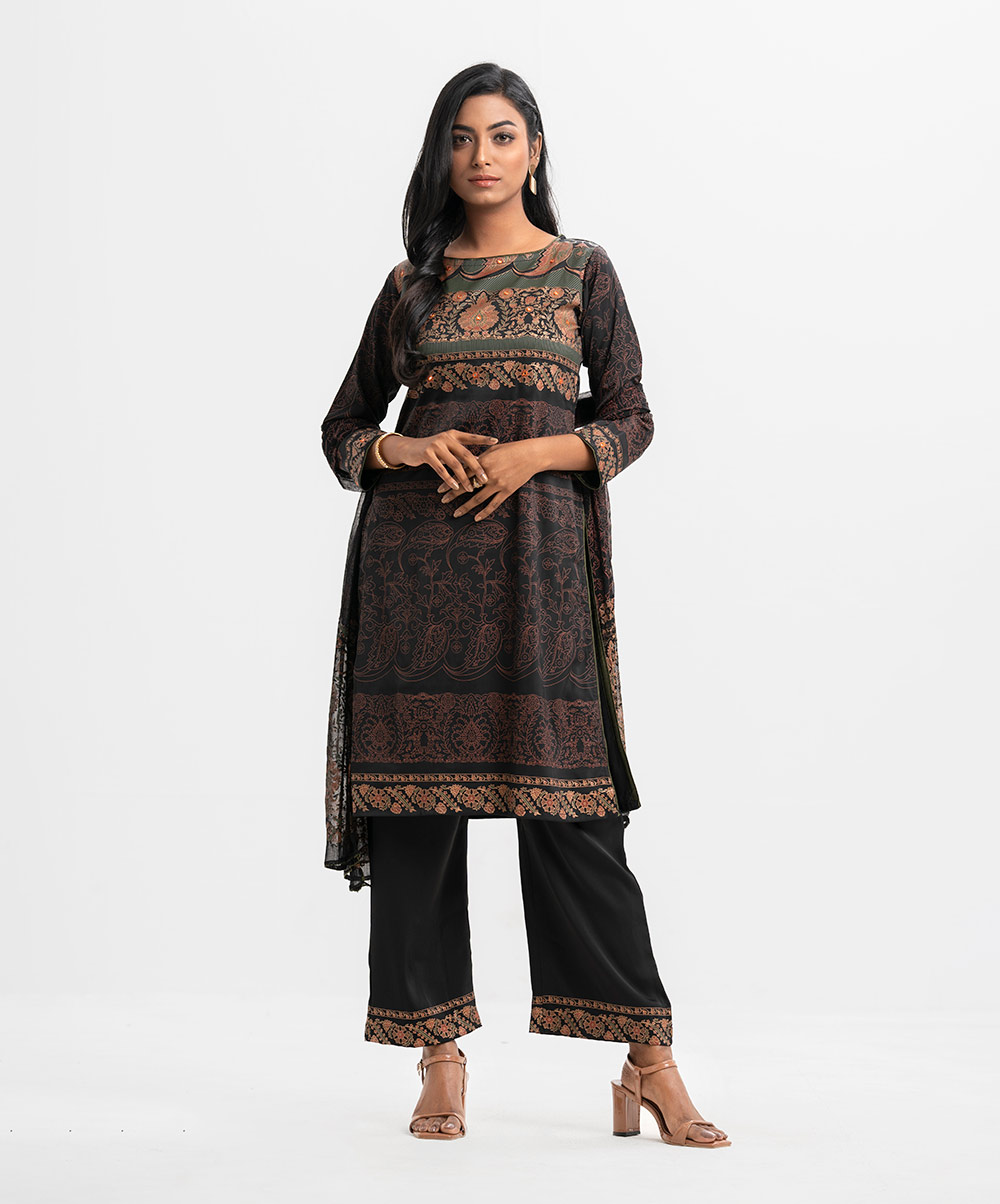 Women’s printed straight salwar kameez in joom fabric. Round, three-quarter sleeves and karchupi at the front. Complemented with a joom palazzo pant and a chiffon dupatta.