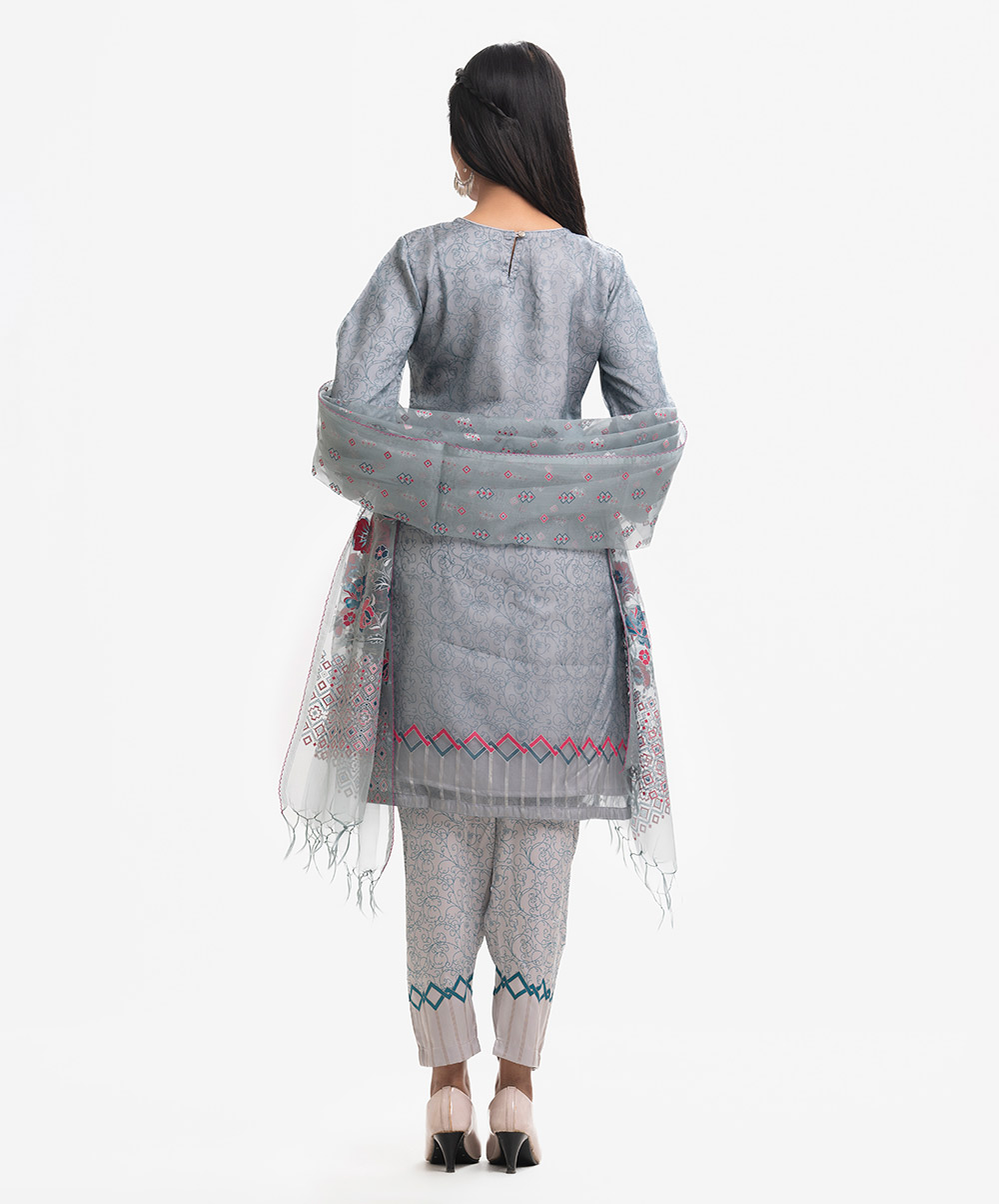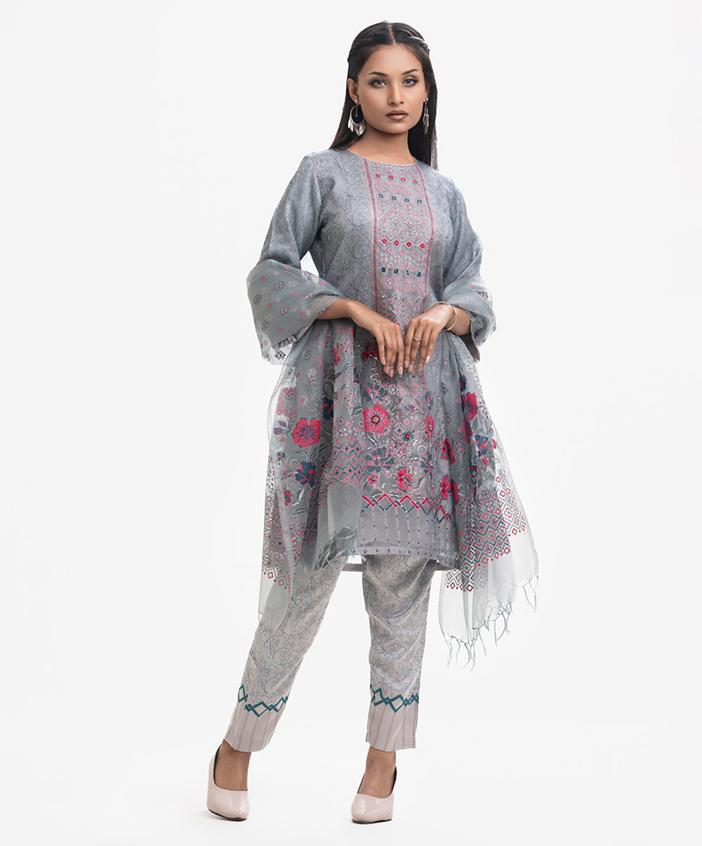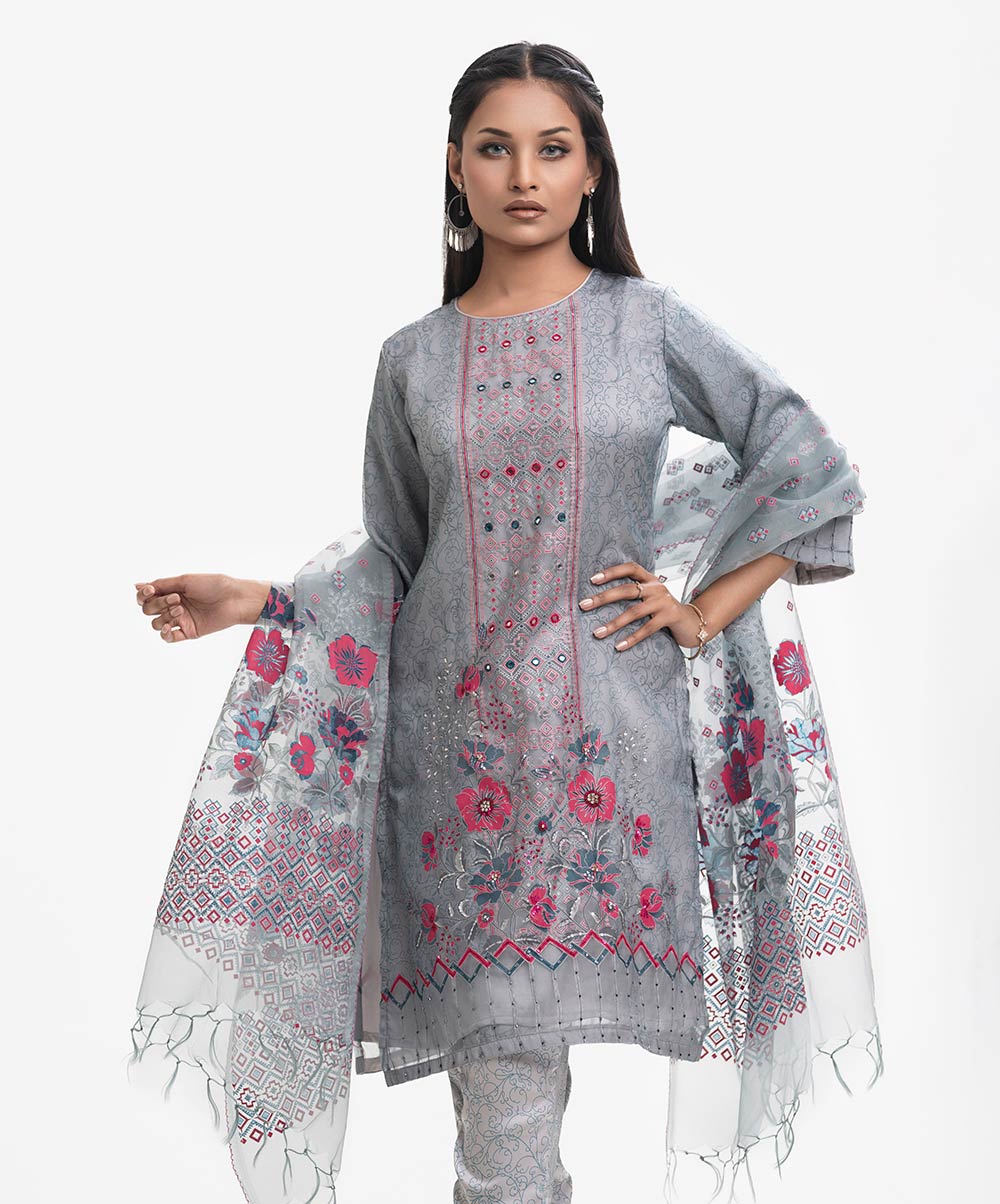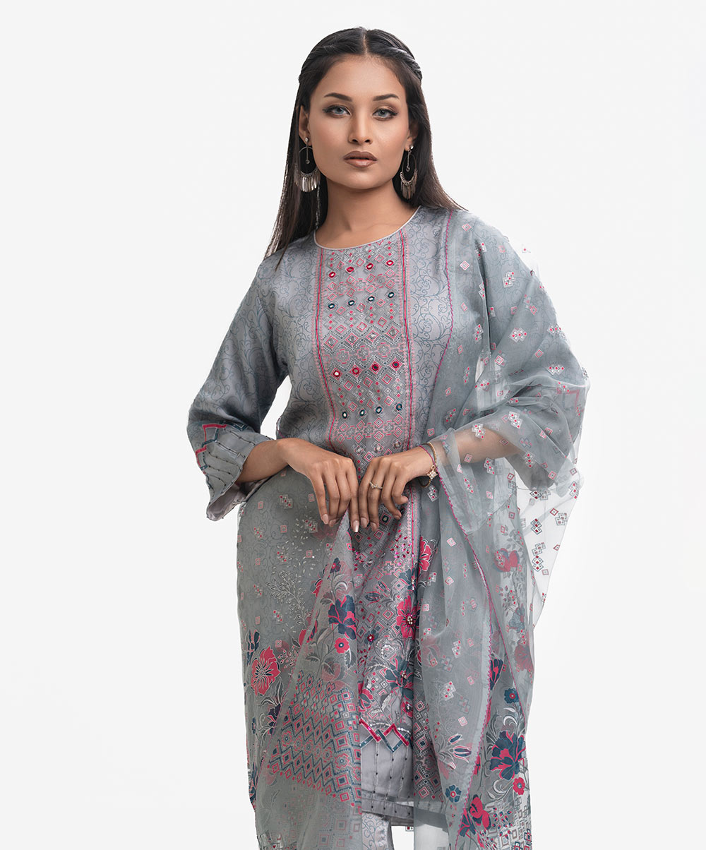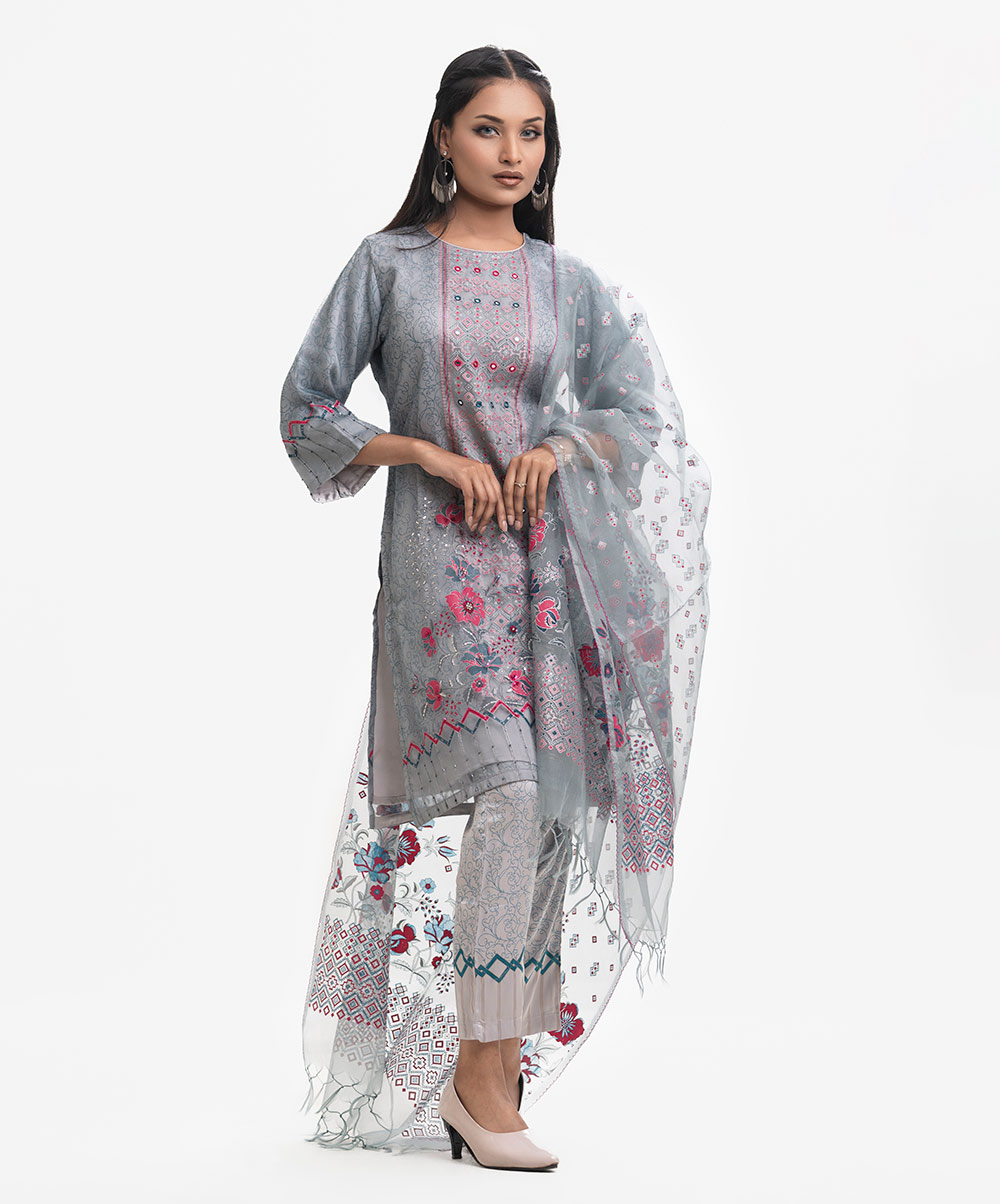 Women’s exclusive salwar kameez in Nargisus by Le Reve. Muslin fabric front part kameez with georgette lining. Round neck, three-quarter sleeves and karchupi detail kameez. With a muslin dupatta & pant-style pajama.