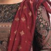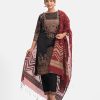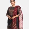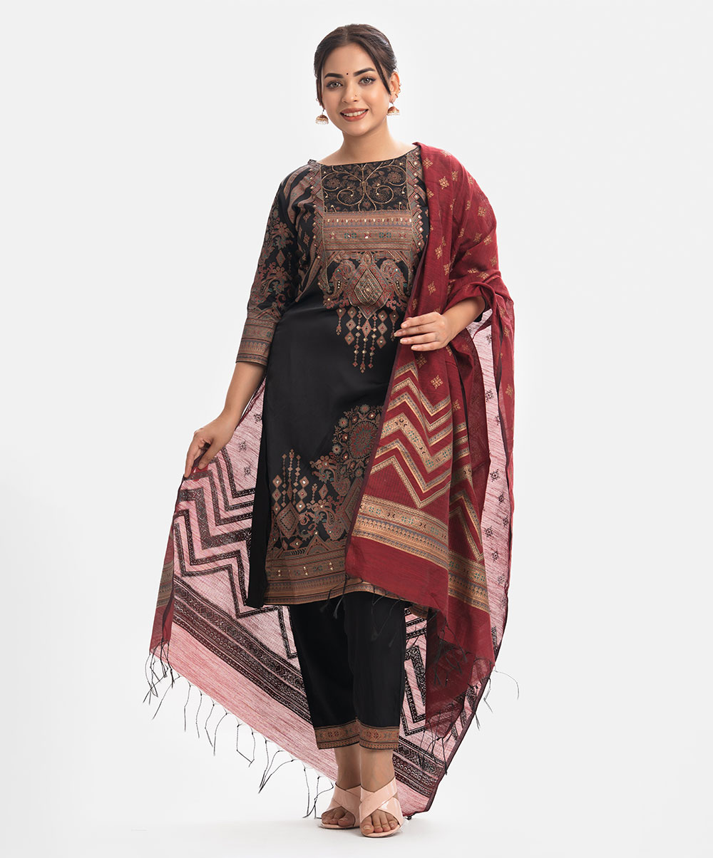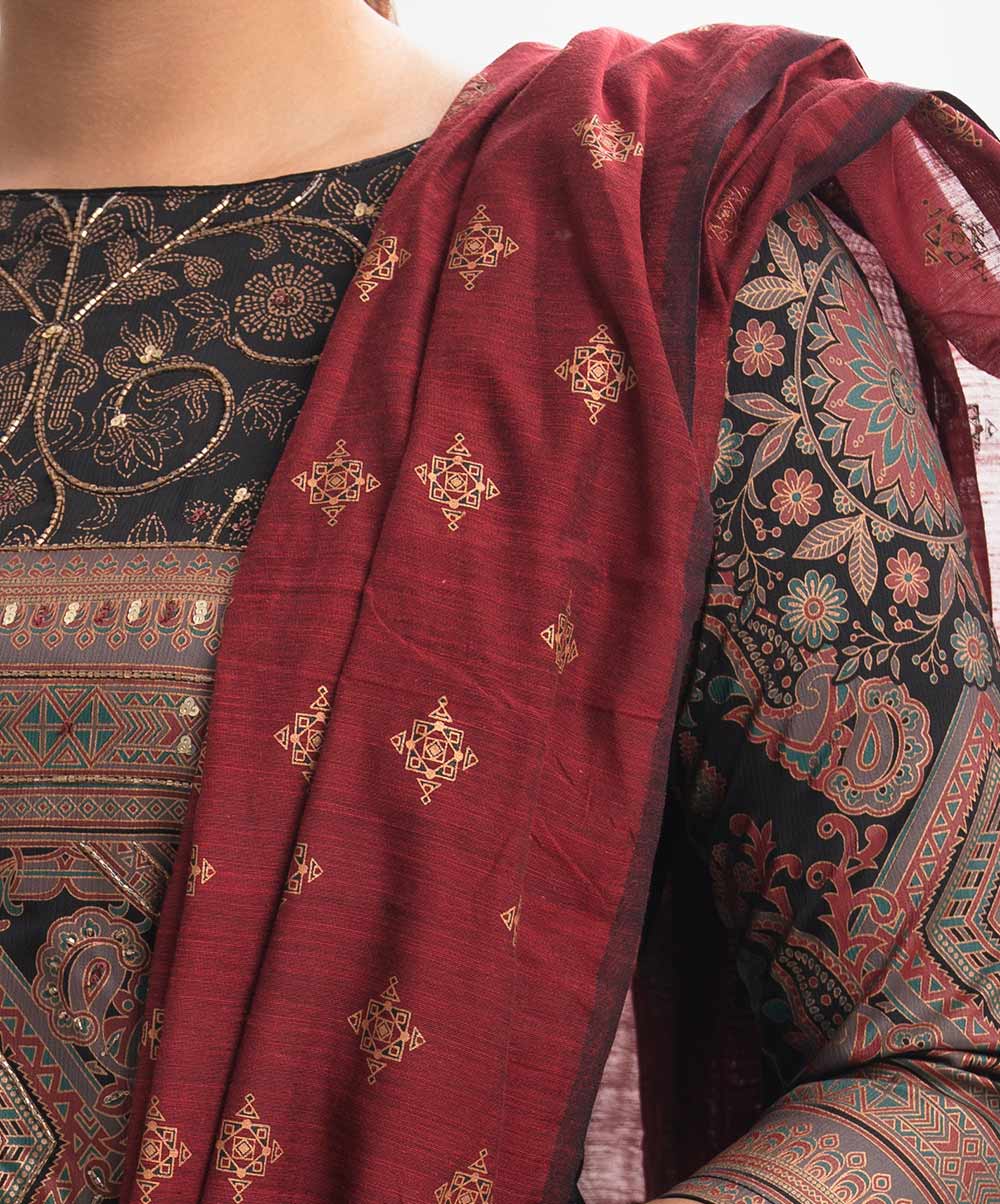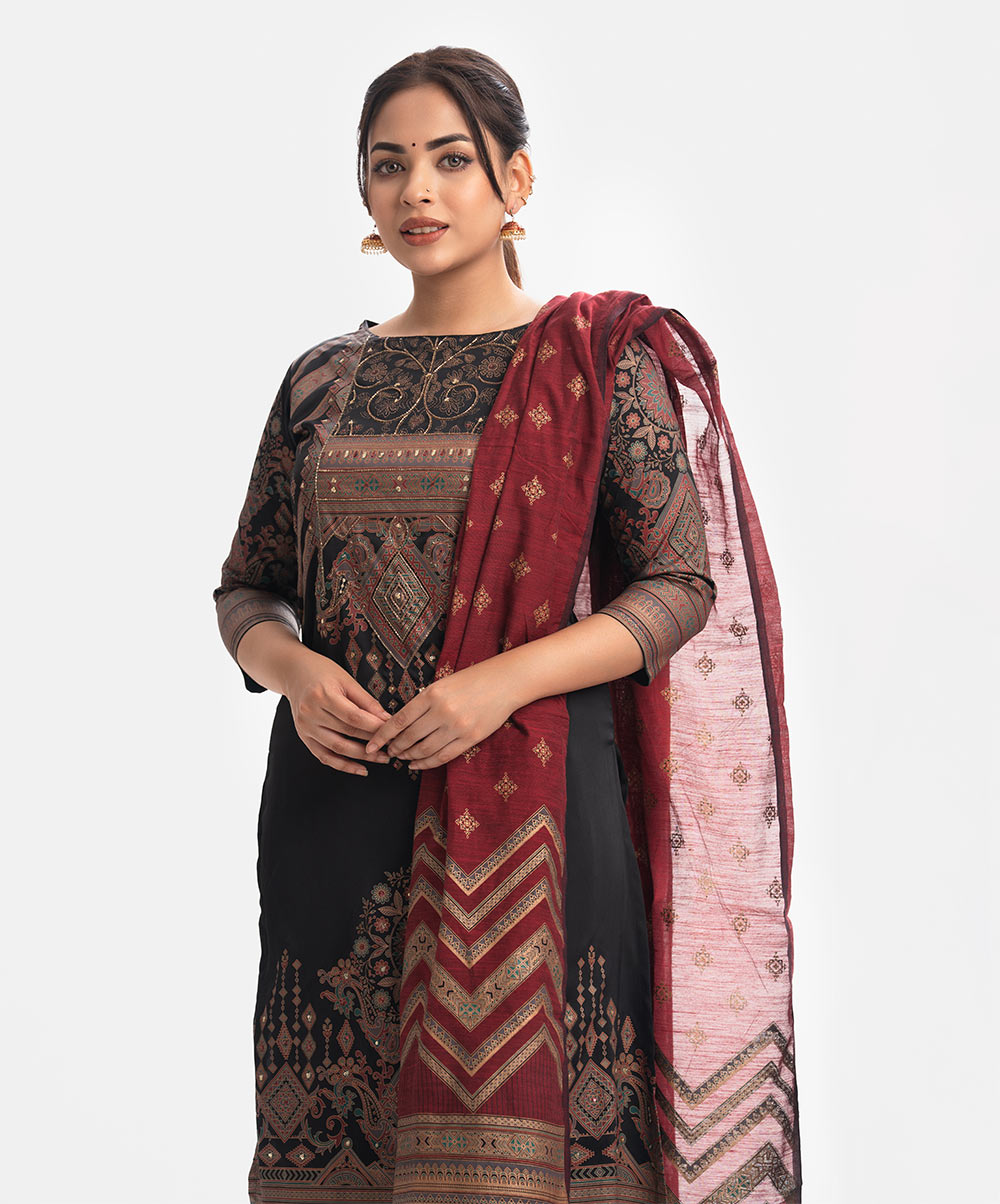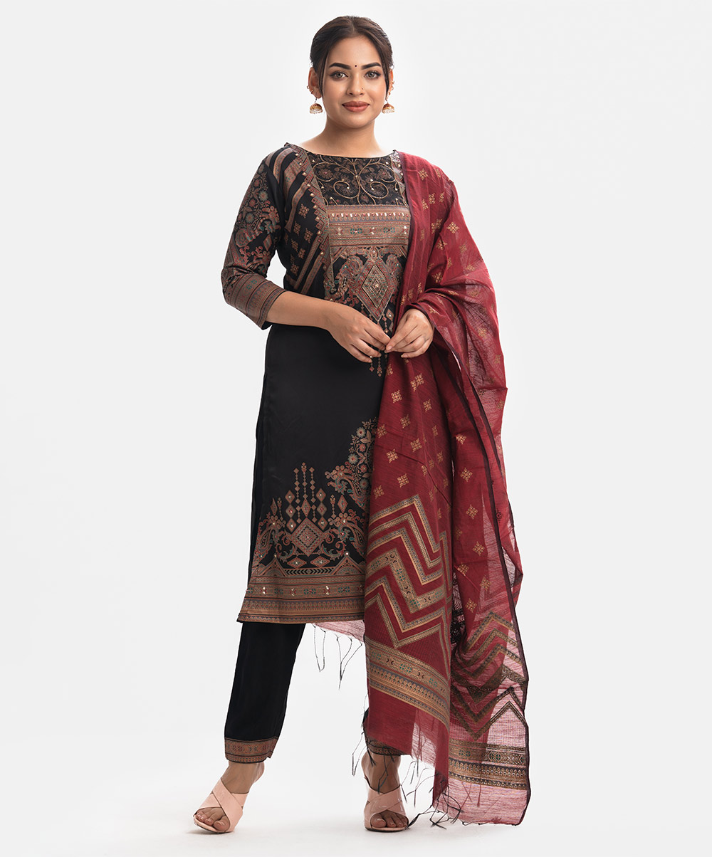 Women’s printed salwar kameez in joom fabric. Boat neck, three-quarter sleeves and heavy karchupi details at front of kameez. Half-silk dupatta with pant-style pajama.