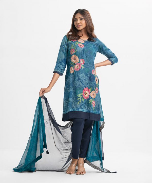 Round neck salwar kameez in cotton-blend fabric. Three-quarter sleeves with karchupi at the front. Complemented with a half-silk dupatta and pant pajamas.