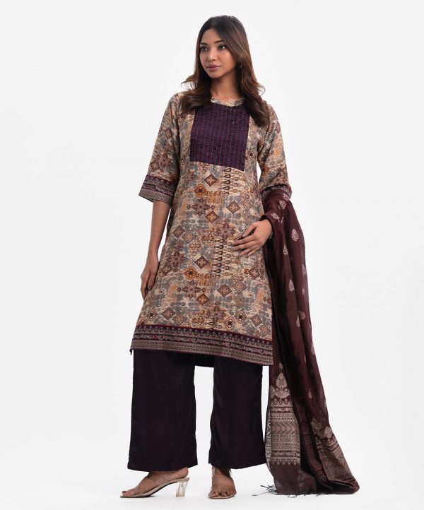 Round neck salwar kameez in cotton-blend fabric. Three-quarter sleeves with karchupi at the front. Complemented with a half silk dupatta and palazzo pants.