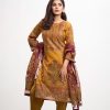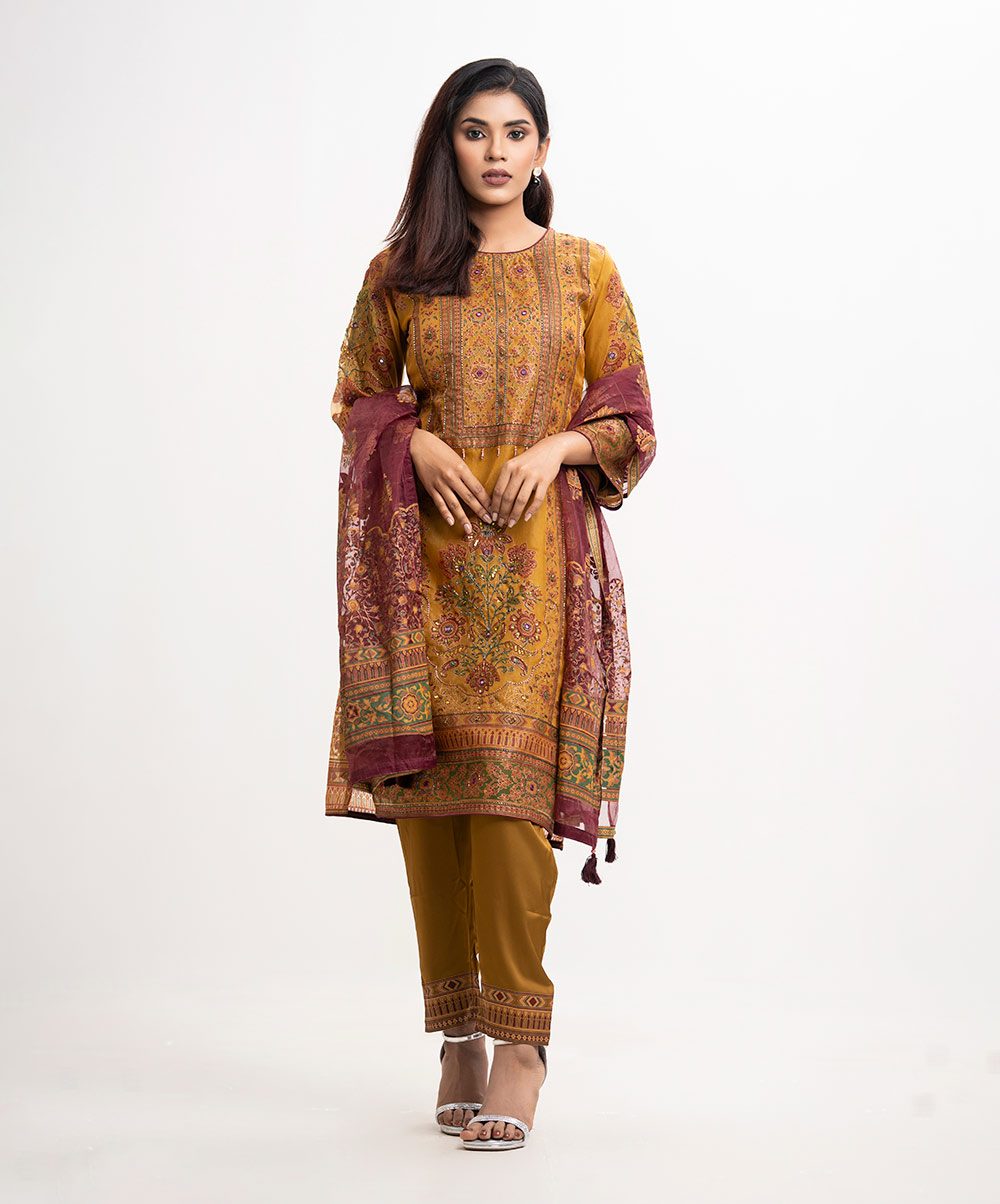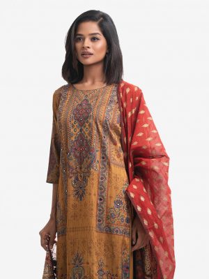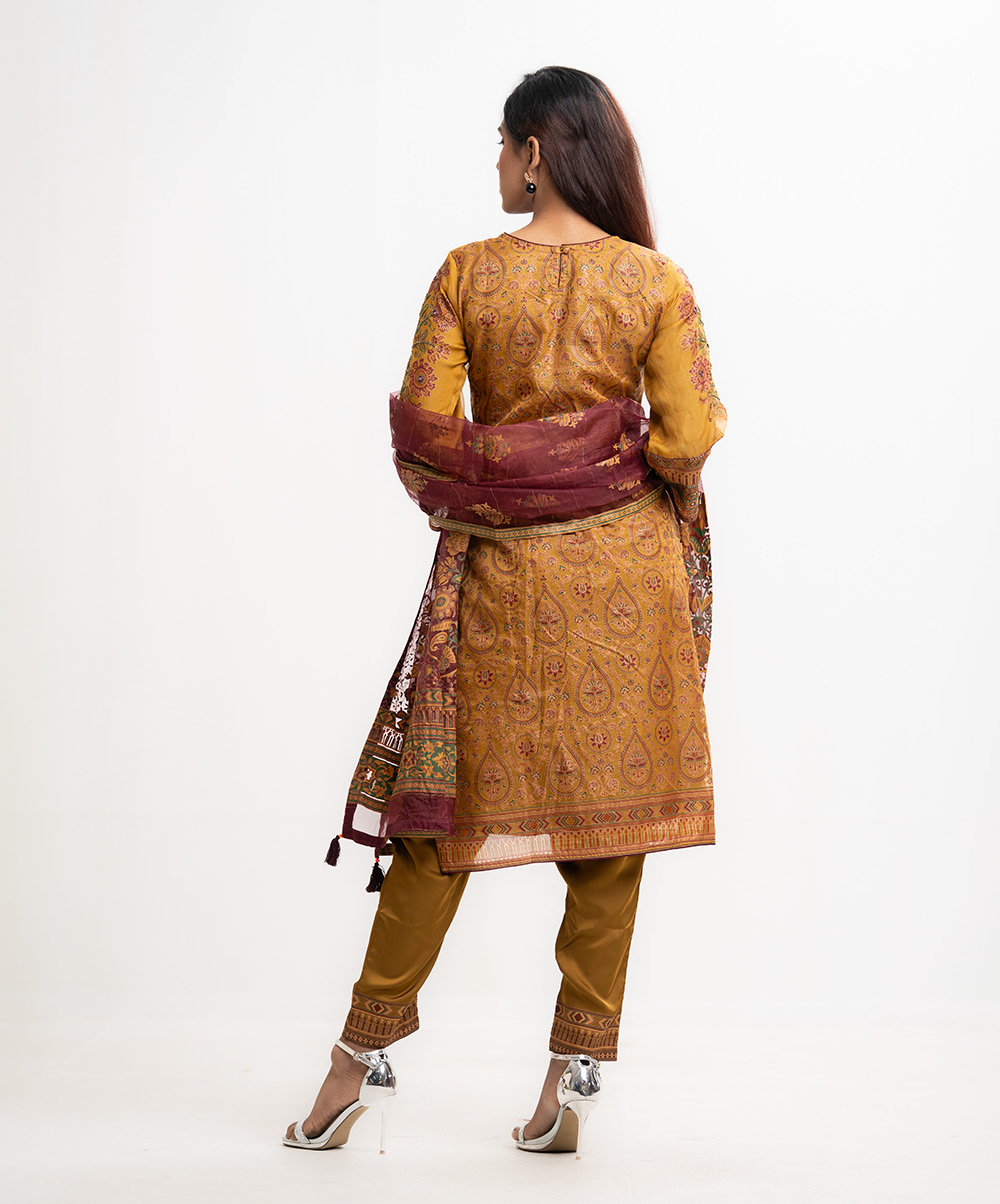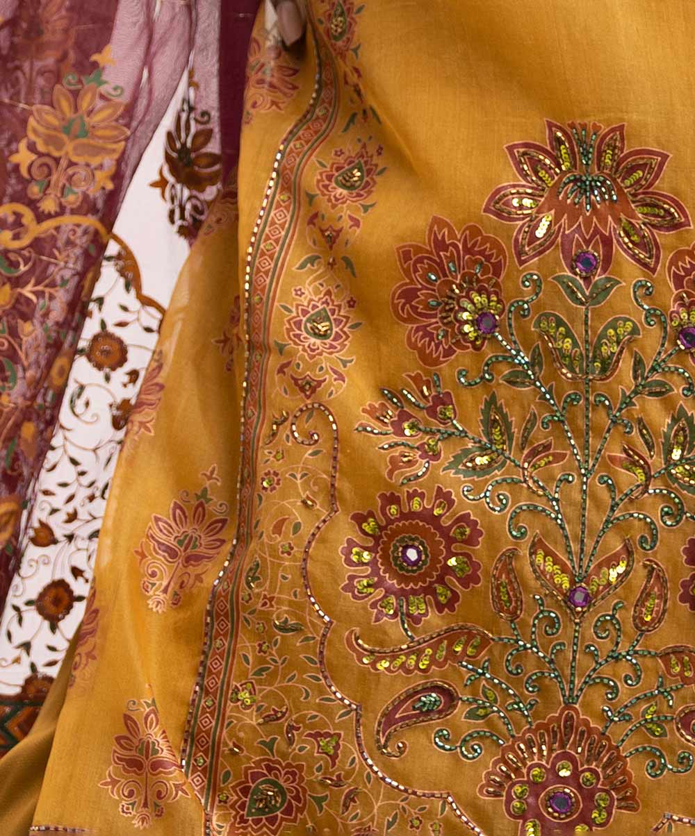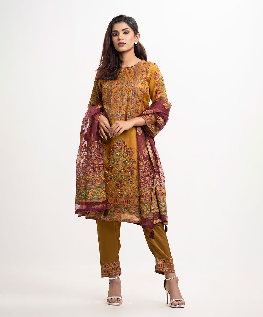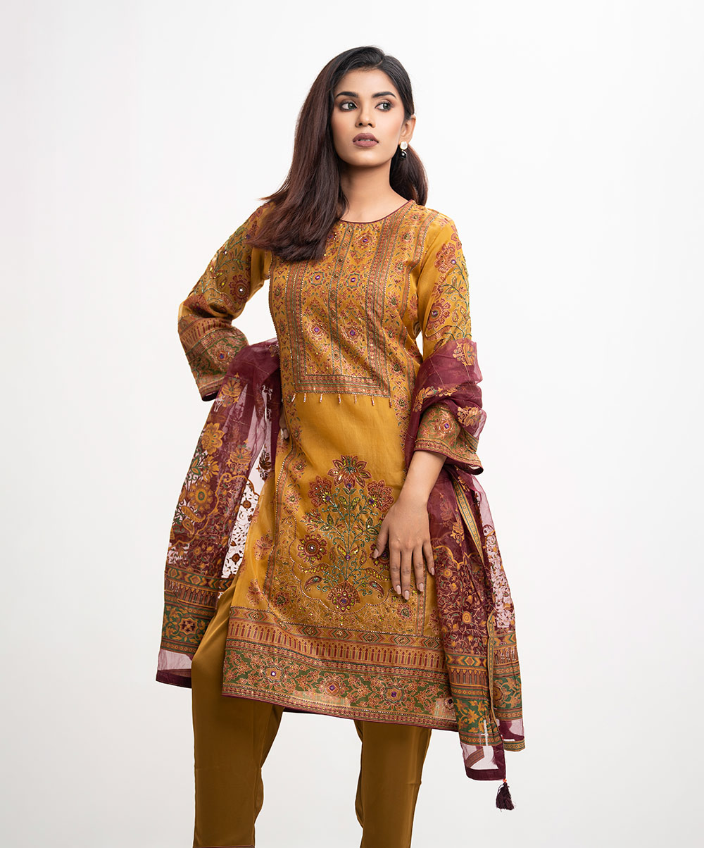 Women’s exclusive salwar kameez in Nargisus by Le Reve. Muslin fabric front part kameez with georgette lining. Round neck, three-quarter sleeves and heavy karchupi detail kameez. With a muslin dupatta & pant-style pajama.