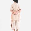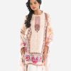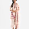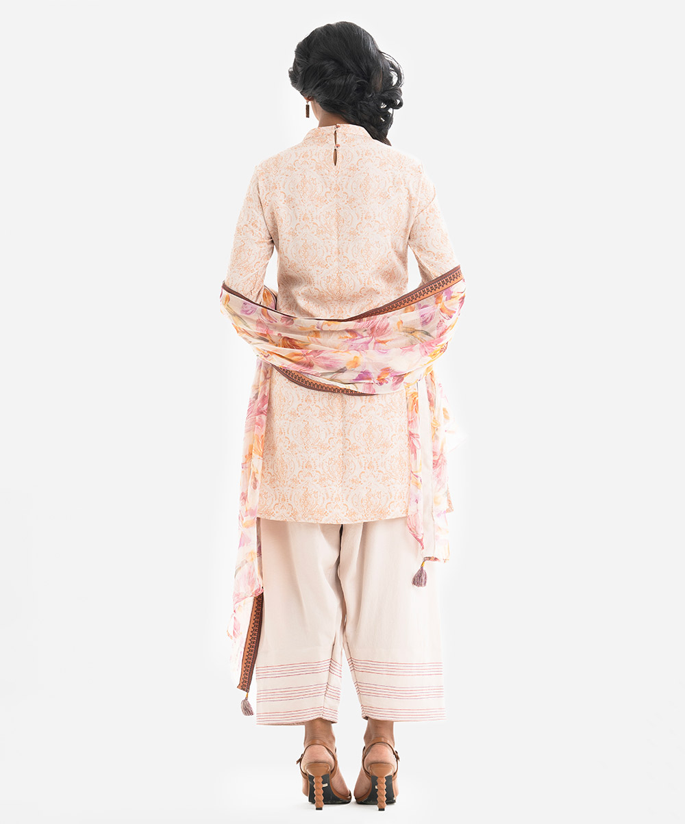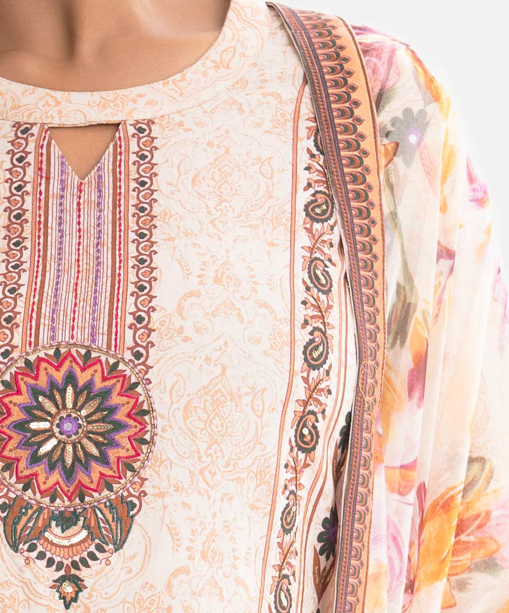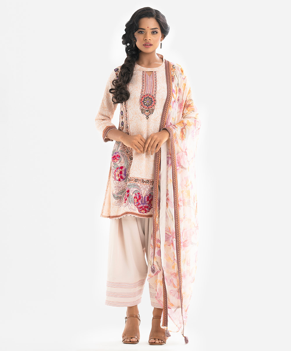 Women’s printed salwar kameez in stretchable faille fabric. Three-quarter sleeves, mock neck kameez with karchupi at front. Printed georgette dupatta with palazzo pants.