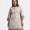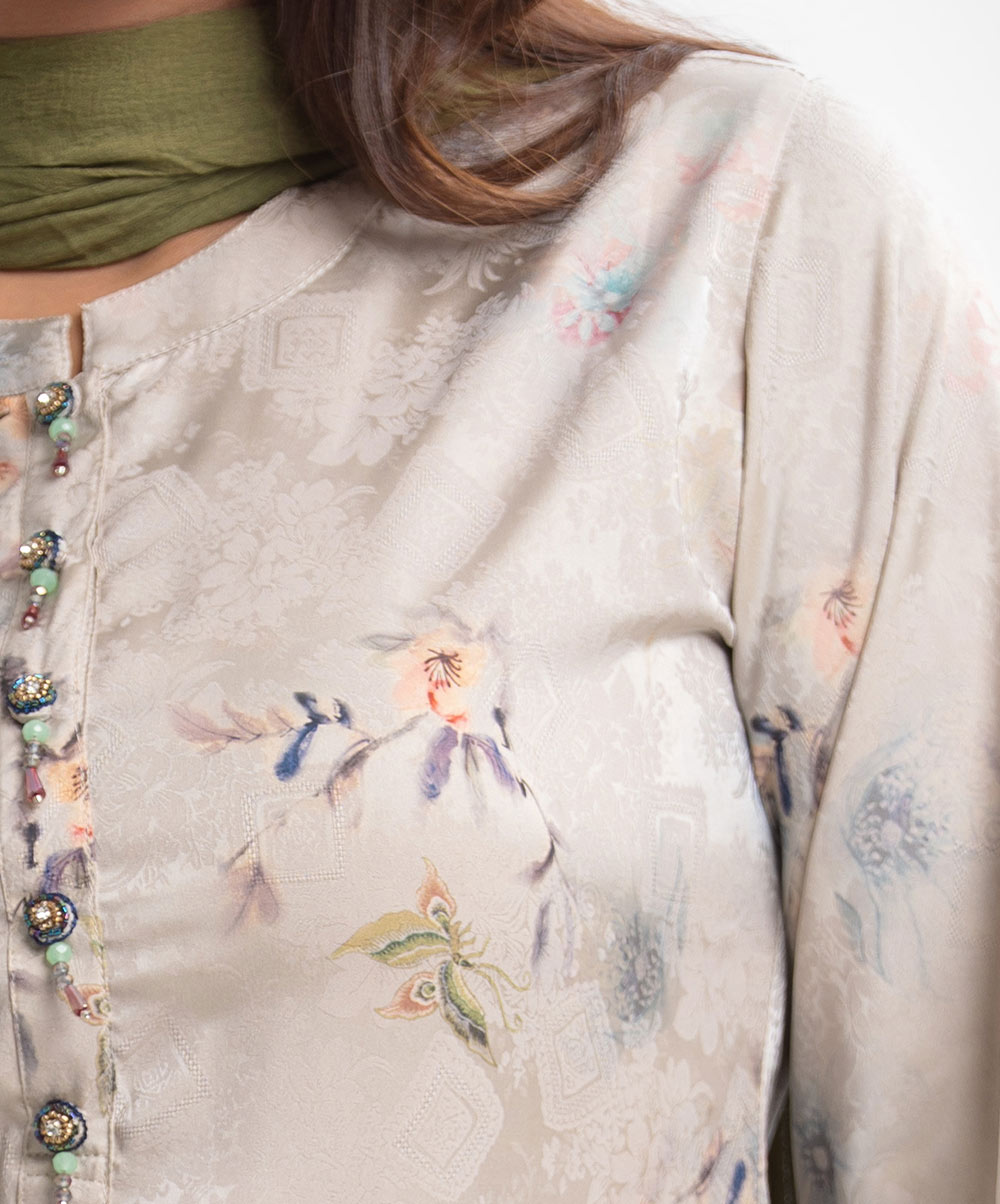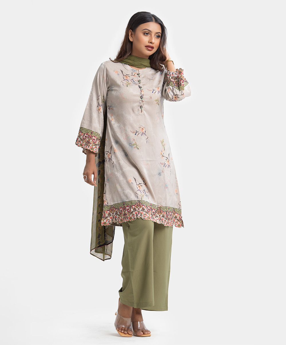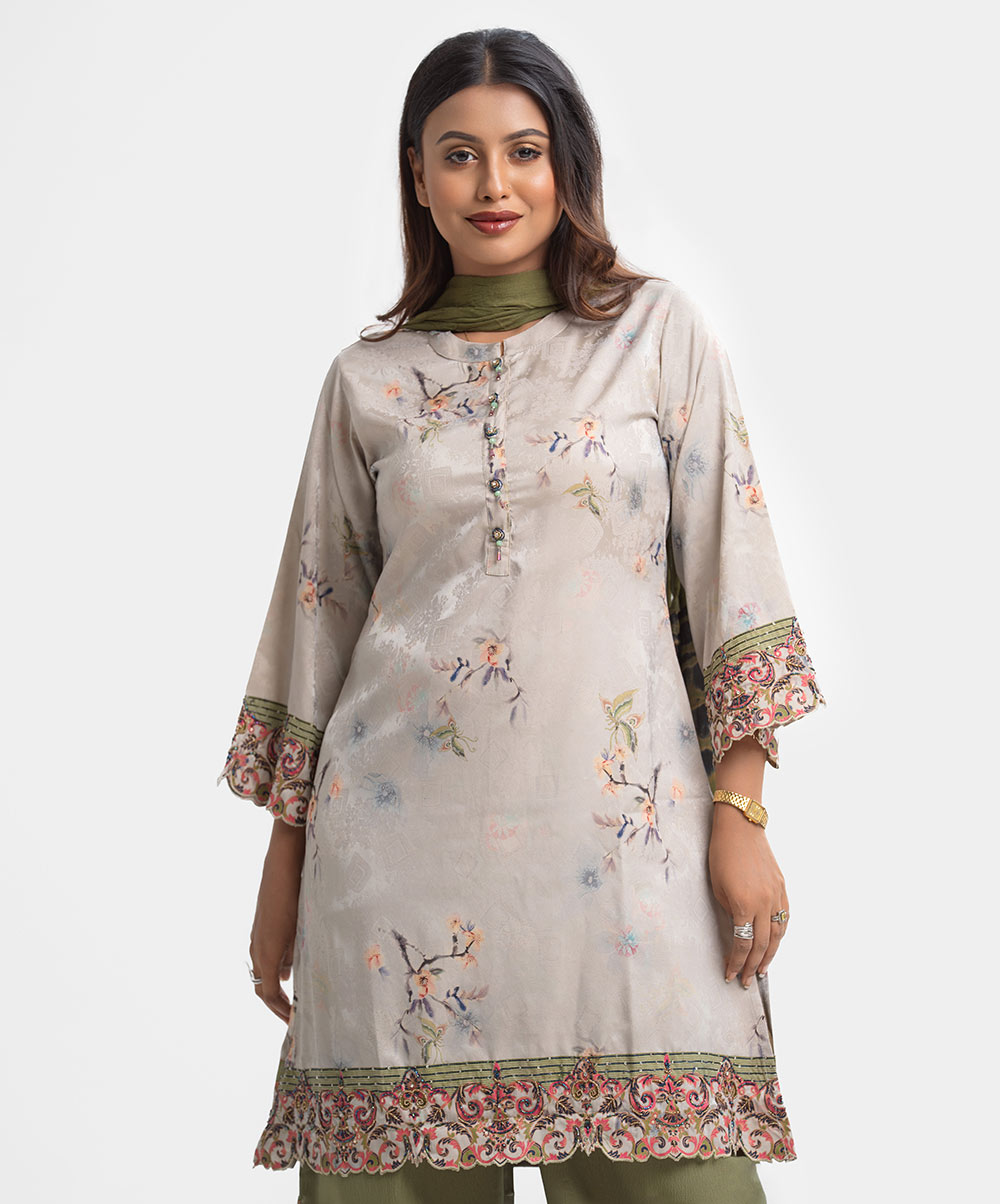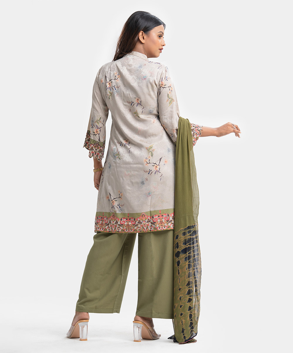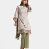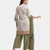 Women’s salwar kameez in Jacquard fabric. Stand collar, bell sleeves and karchupi at placket, cutwork sleeves & hemline of kameez. Comes with a chiffon dupatta and palazzo pants.