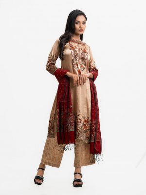 Women’s printed salwar kameez in georgette fabric. Round neck, three-quarter sleeves and karchupi at the front of kameez. Chiffon dupatta with pant-style pajama.