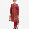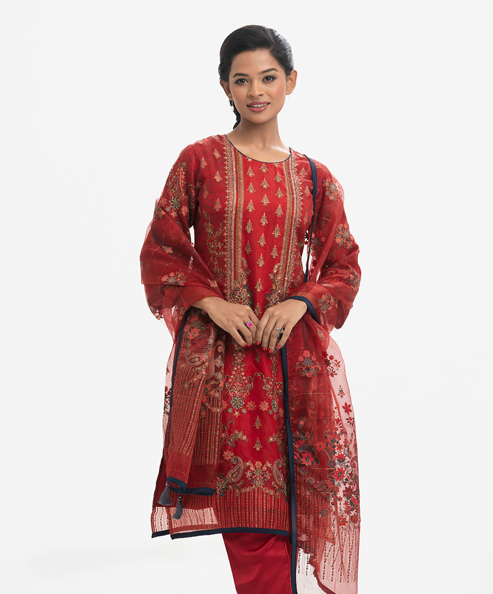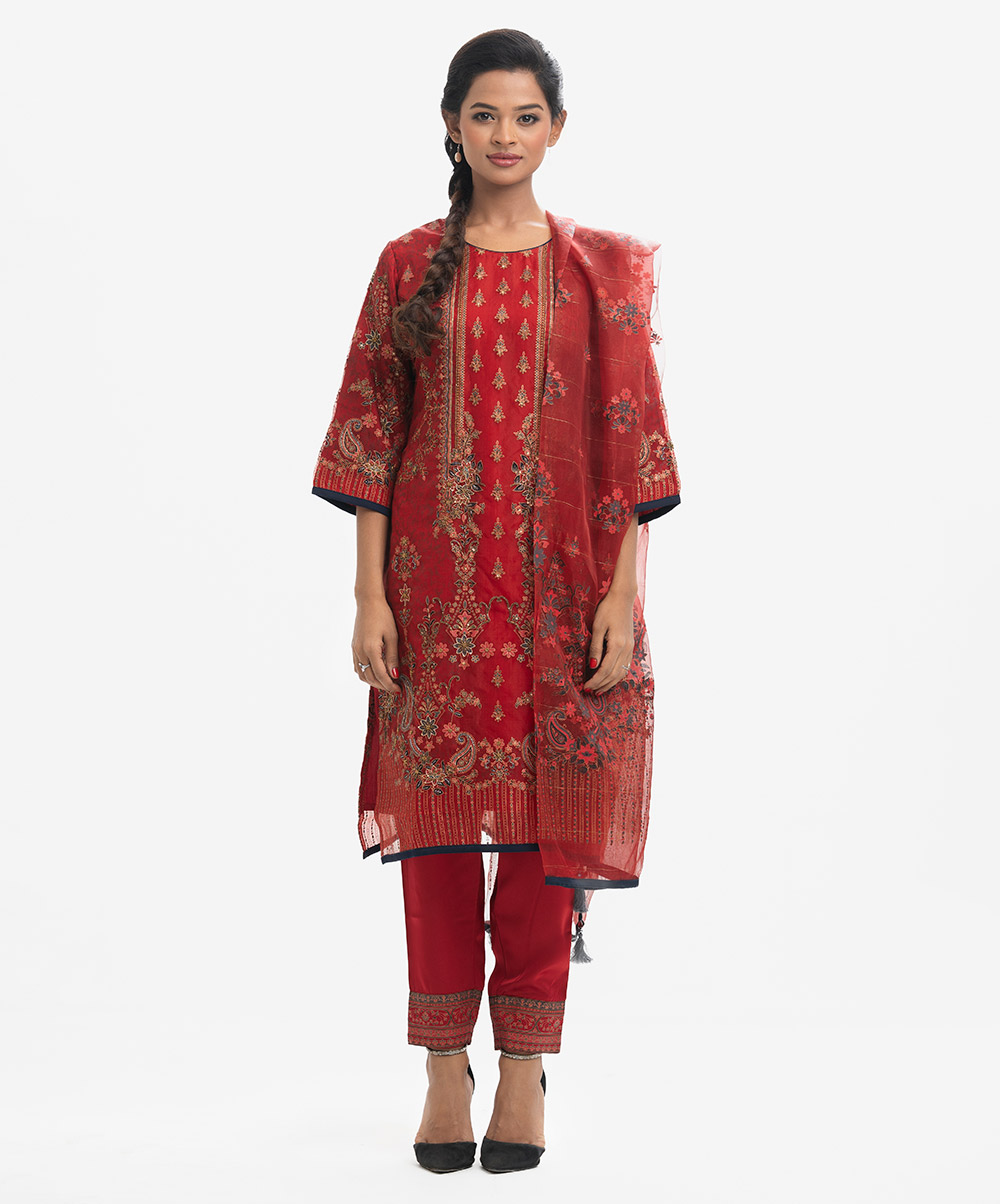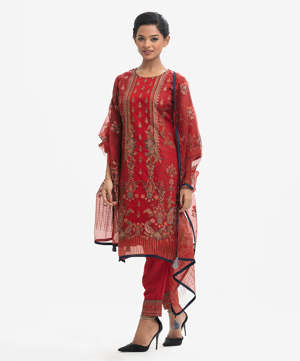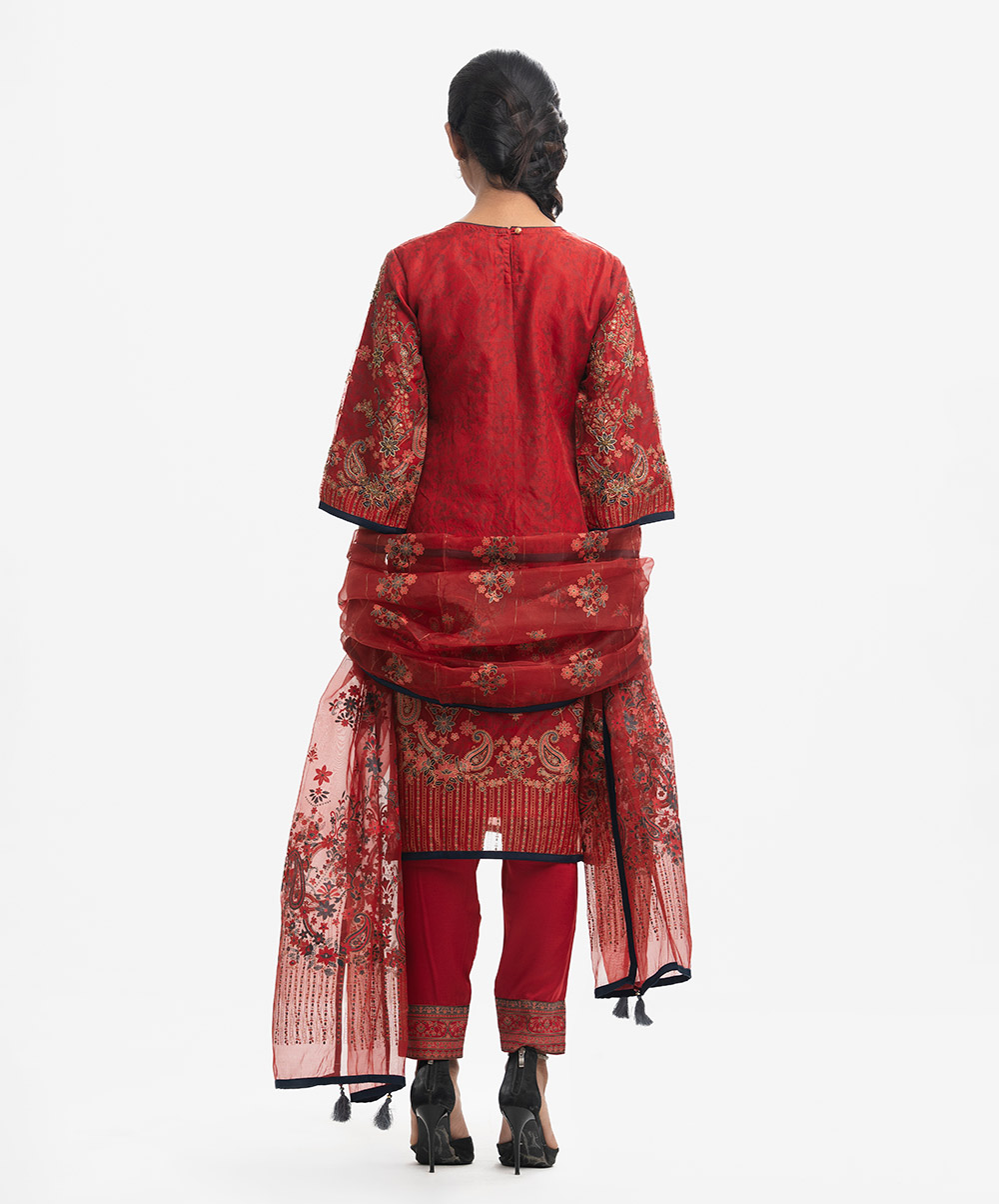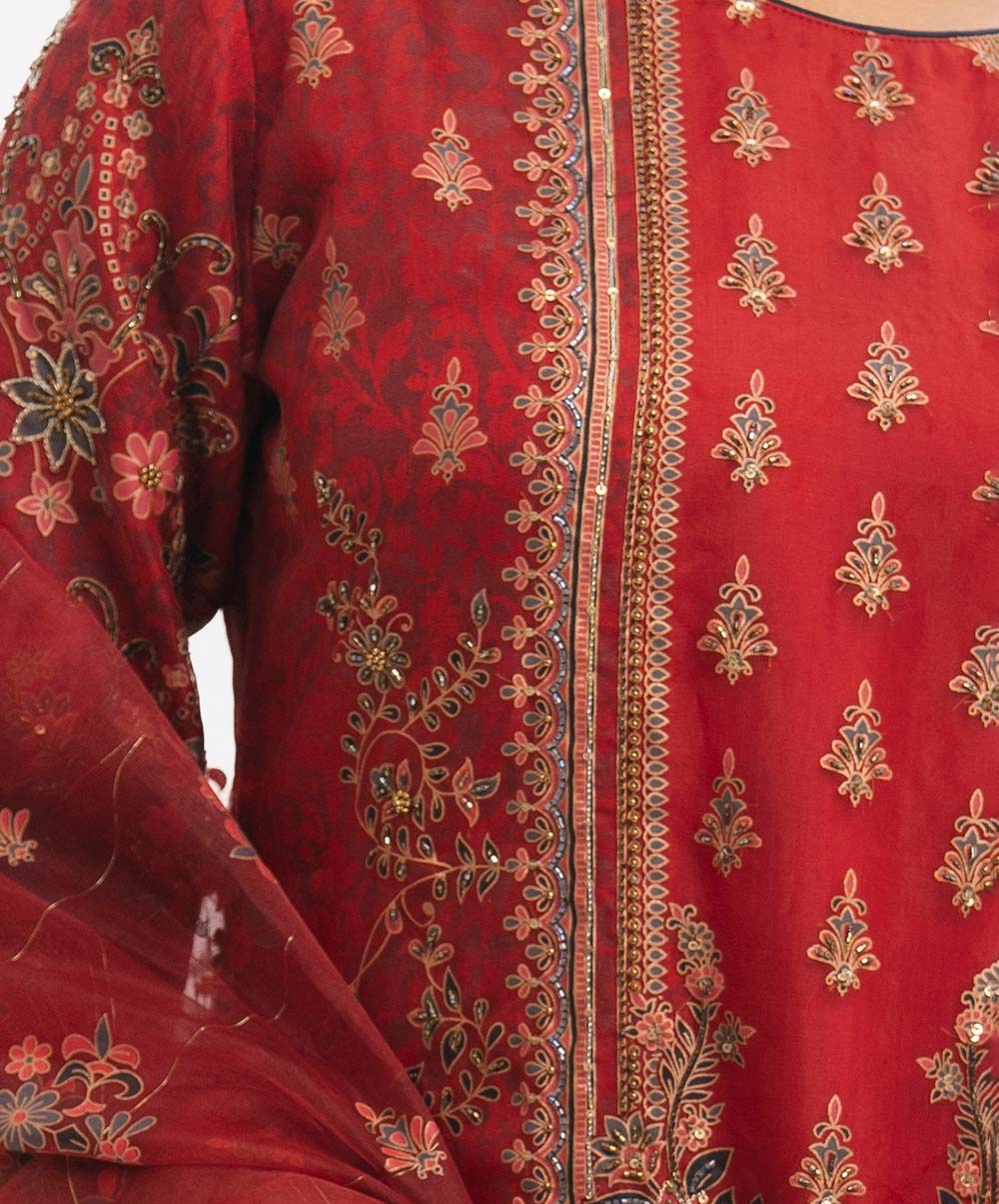 Women’s exclusive salwar kameez in Nargisus by Le Reve. Printed front part in muslin fabric with georgette lining. Round neck, three-quarter sleeves and karchupi at the front of the kameez. With a muslin dupatta & pant-style pajama.