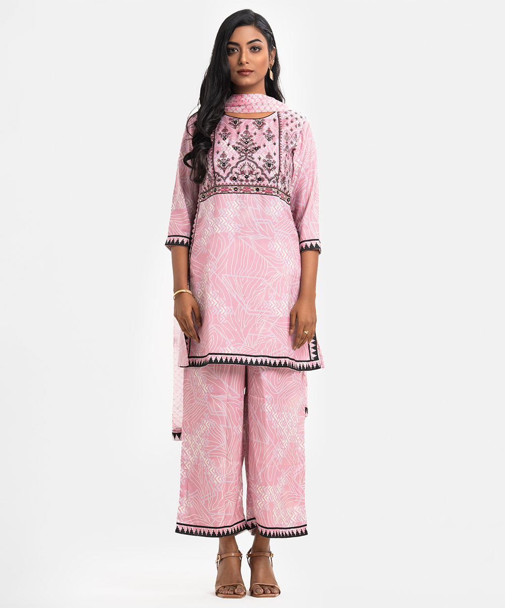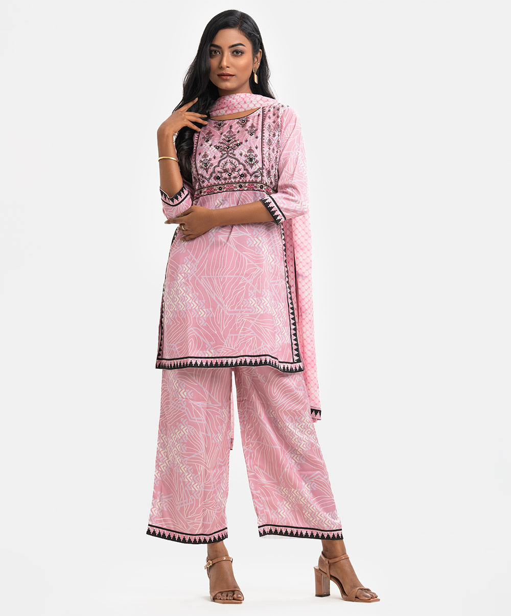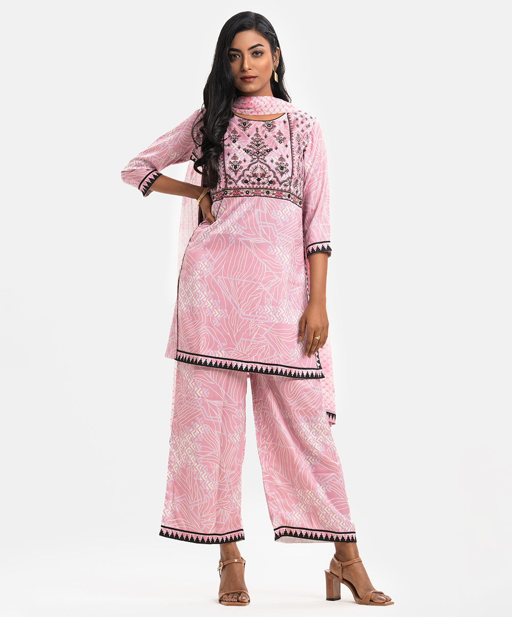 Women’s printed straight salwar kameez in stretched satin fabric. Round neck, three-quarter sleeves and embroidery at the front. Complemented with matching palazzo pants and a chiffon dupatta.