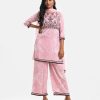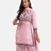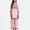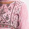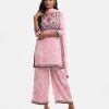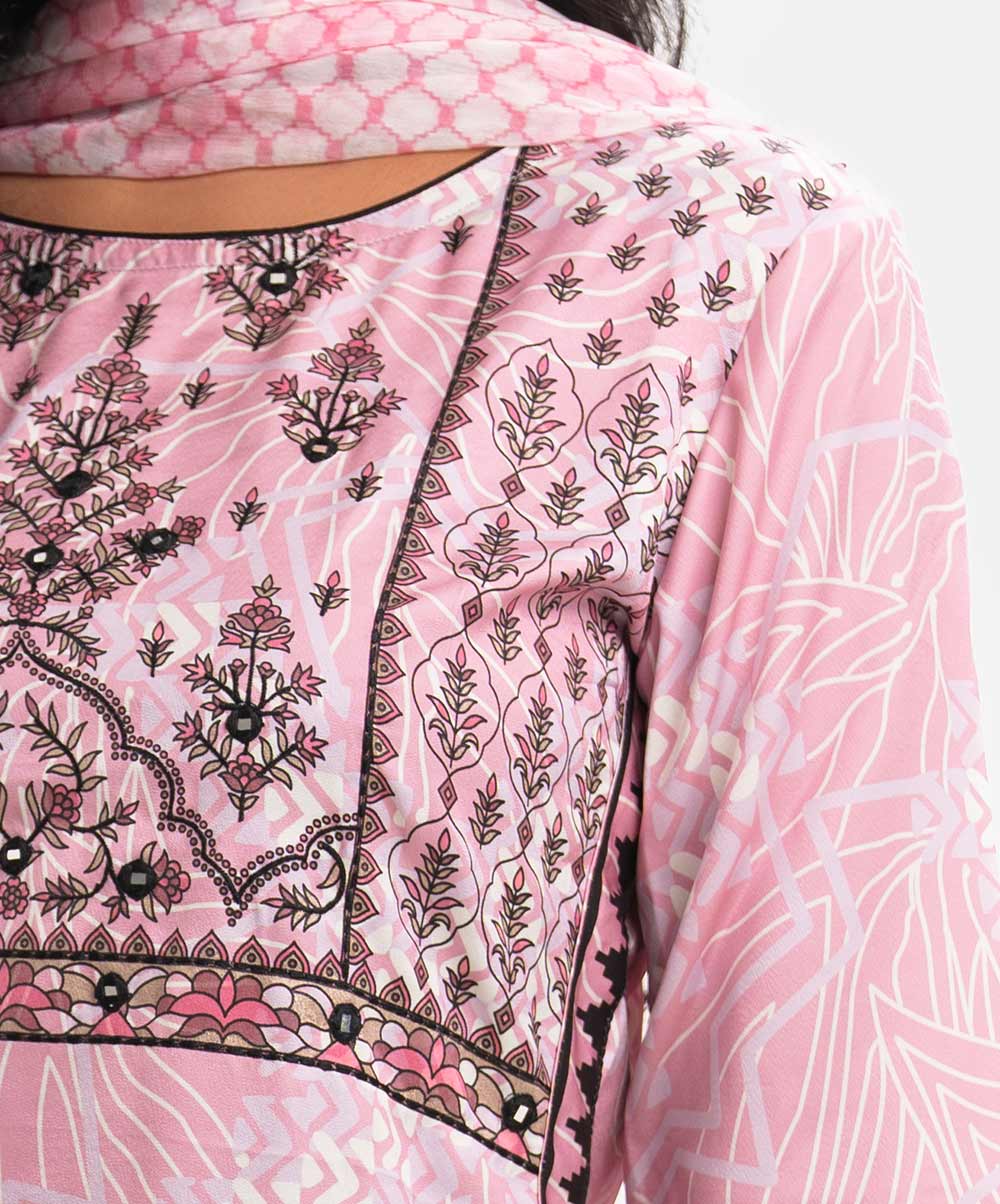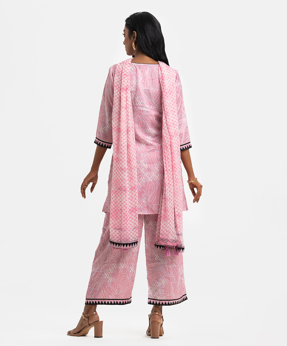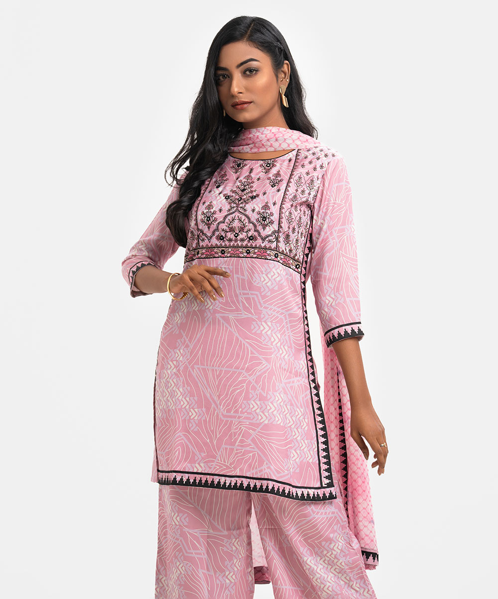 Women’s printed straight salwar kameez in stretched satin fabric. Round neck, three-quarter sleeves and embroidery at the front. Complemented with matching palazzo pants and a chiffon dupatta.