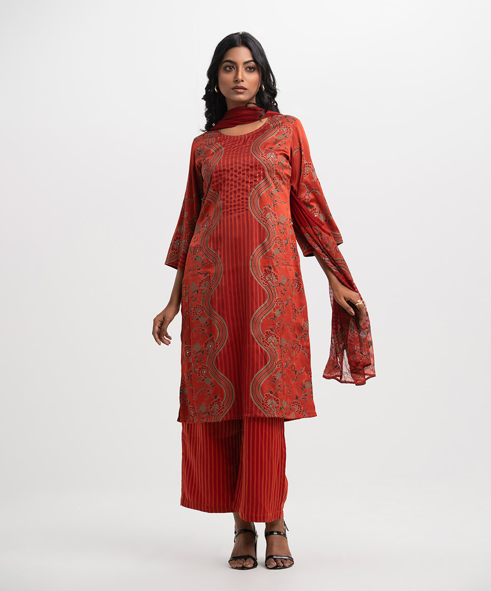 Women’s floral printed salwar kameez in georgette fabric. Round neck, three-quarter sleeves and karchupi at the front of kameez. Chiffon dupatta with palazzo pants.