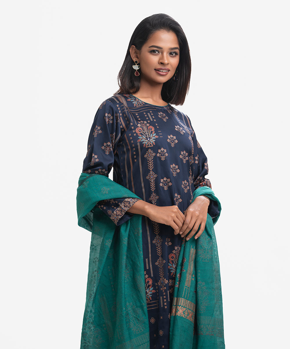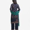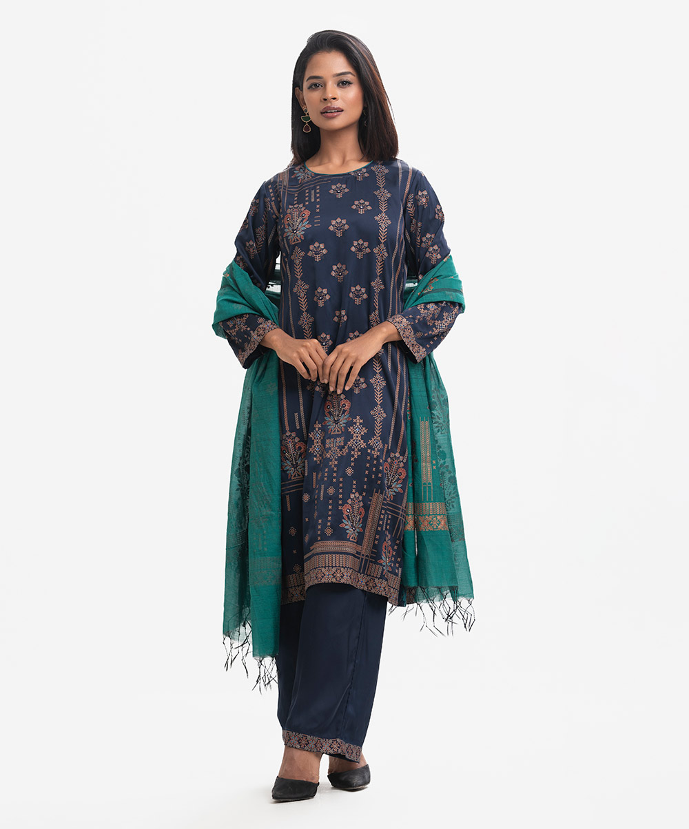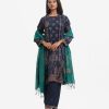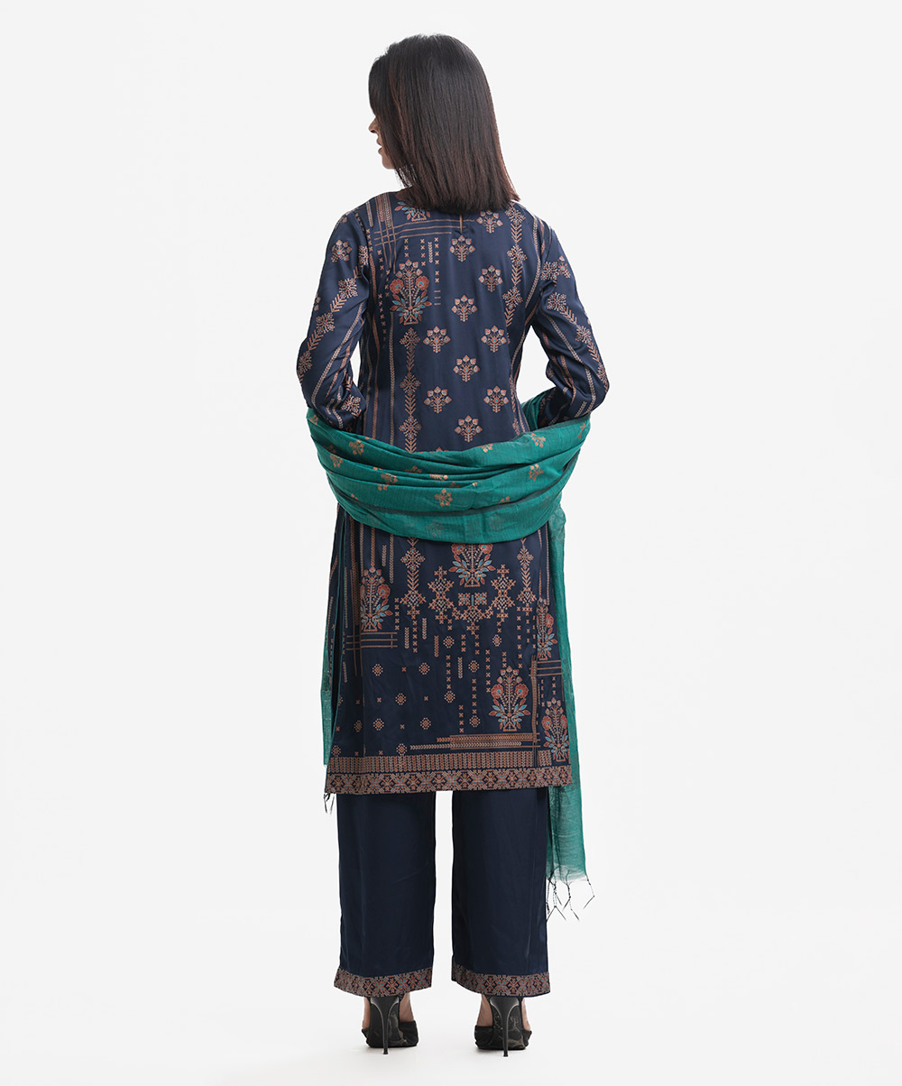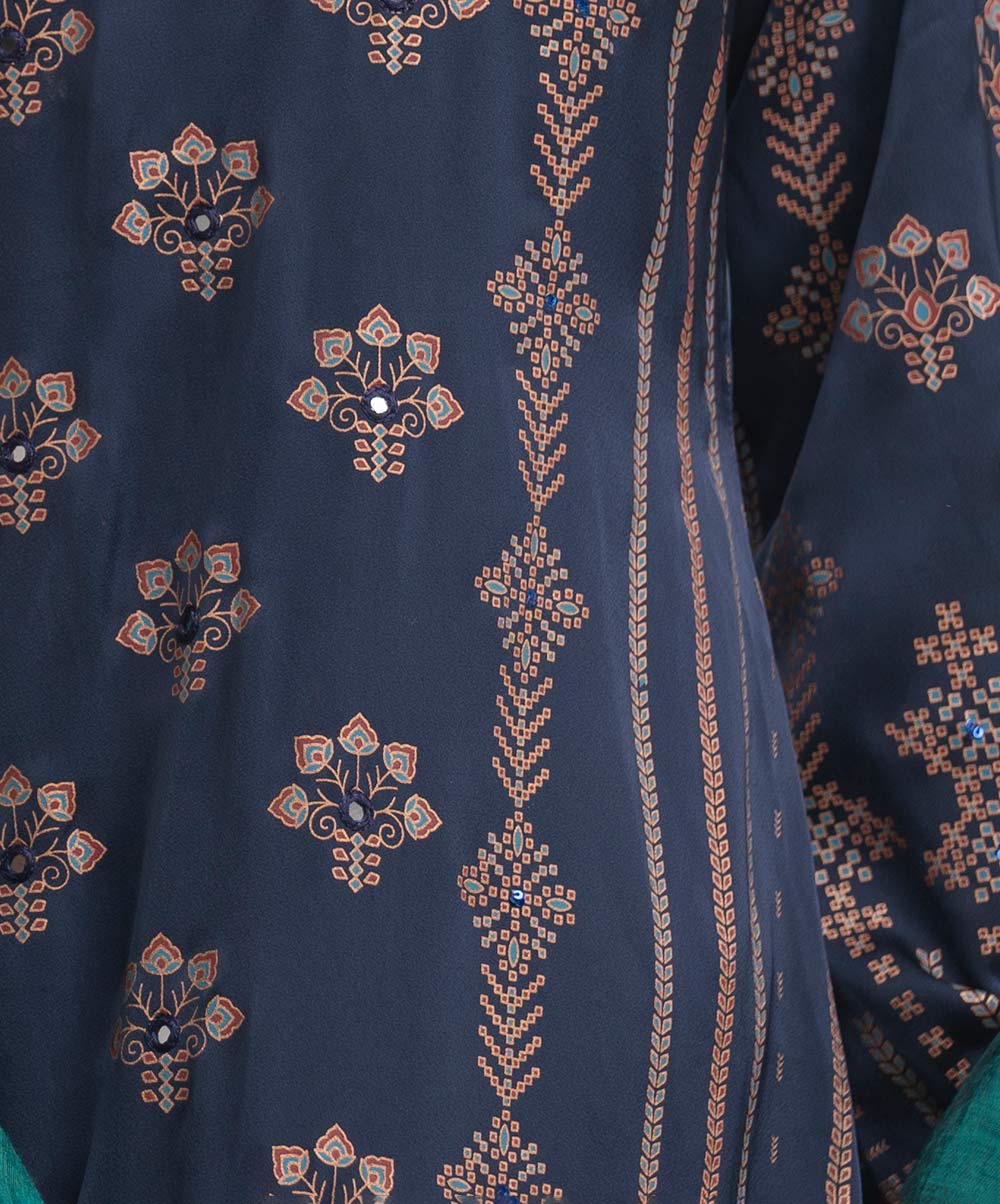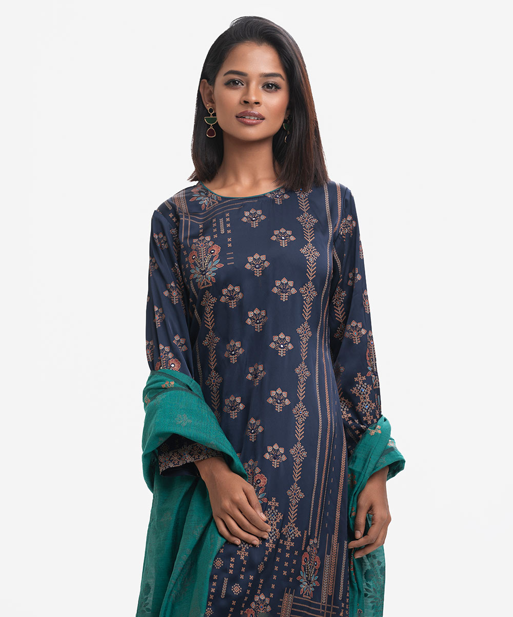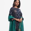 Round neck, full-sleeved A-line kameez in satin-georgette fabric with karchupi. Complemented with an elasticated waist palazzo and a matching half-silk dupatta. Karchupi detailed.