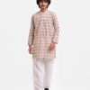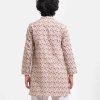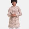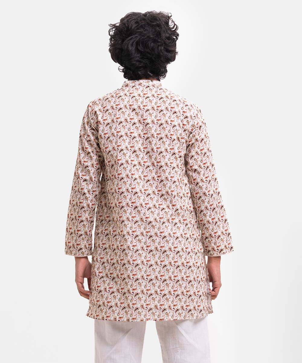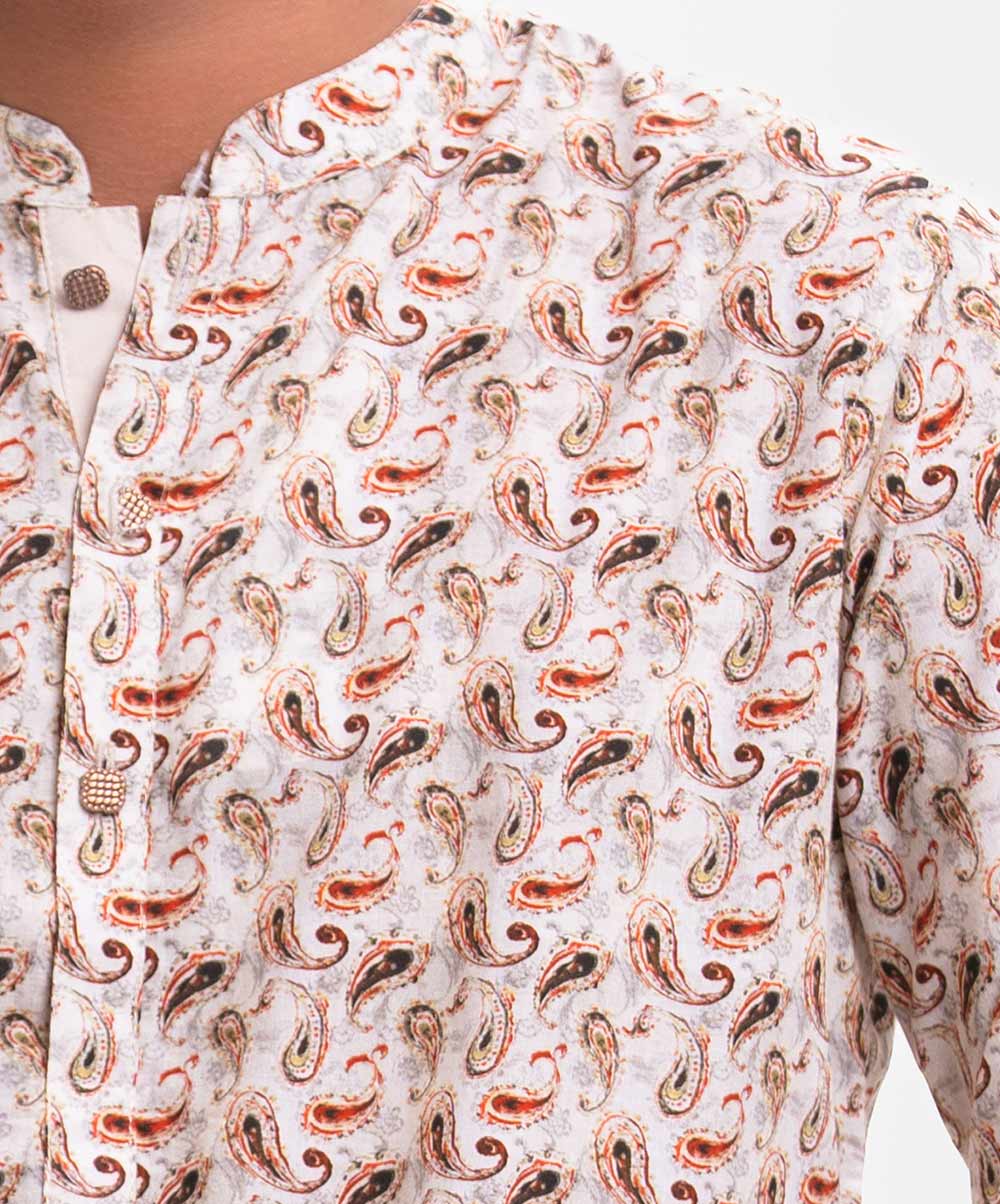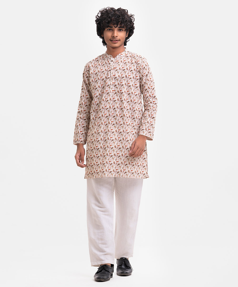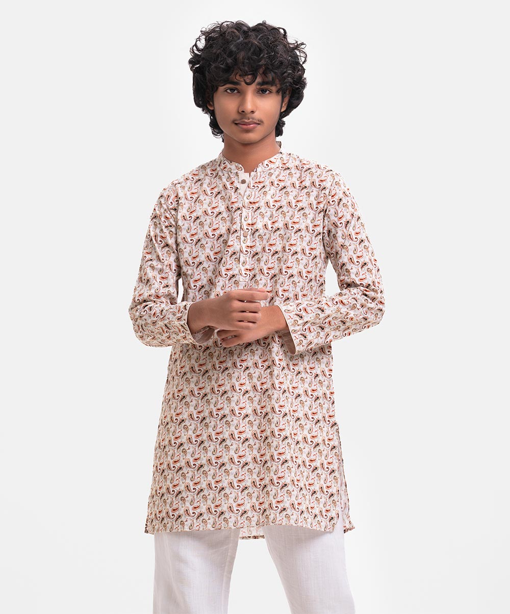 Teen boy’s paisley printed panjabi in cotton fabric. Mandarin collar with metal buttons placket and inseam pockets.