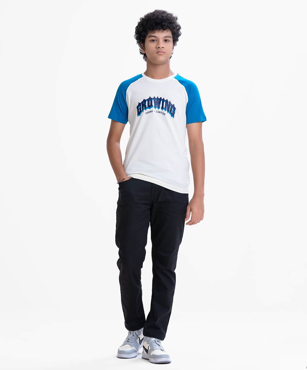 Teen boys short sleeve t-shirt in cotton single jersey fabric. Crew neck and typographic print at front.